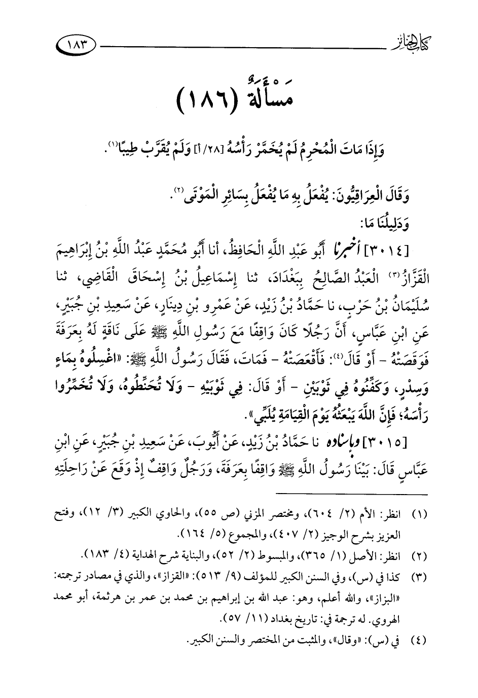 [3014] أخبرنا أَبُو عَبْدِ اللَّهِ الْحَافِظُ، أنا أَبُو مُحَمَّدٍ عَبْدُ اللَّهِ بْنُ إِبْرَاهِيمَ الْقَزَّازُ (¬3) الْعَبْدُ الصَّالِحُ بِبَغْدَادَ، ثنا إِسْمَاعِيلُ بْنُ إِسْحَاقَ الْقَاضِي، ثنا سُلَيْمَانُ بْنُ حَرْبٍ، نا حَمَّادُ بْنُ زَيْدٍ، عَنْ عَمْرِو بْنِ دِينَارٍ، عَنْ سَعِيدِ بْنِ جُبَيْرٍ، عَنِ ابْنِ عَبَّاسٍ، أَنَّ رَجُلًا كَانَ وَاقِفًا مَعَ رَسُولِ اللَّهِ - صلى الله عليه وسلم - عَلَى نَاقَةٍ لَهُ بِعَرَفَةَ فَوَقَصَتْهُ - أَوْ قَالَ (¬4): فَأَقْعَصَتْهُ - فَمَاتَ، فَقَالَ رَسُولُ اللَّهِ - صلى الله عليه وسلم -: "اغْسِلُوهُ بِمَاءٍ وَسِدْرٍ، وَكَفِّنُوهُ فِي ثَوْبَيْنِ - أَوْ قَالَ: فِي ثَوْبَيْهِ - وَلَا تُحَنِّطُوهُ، وَلَا تُخَمِّرُوا رَأْسَهُ؛ فَإِنَّ اللَّهَ يَبْعَثُهُ يَوْمَ الْقِيَامَةِ يُلَبِّي".