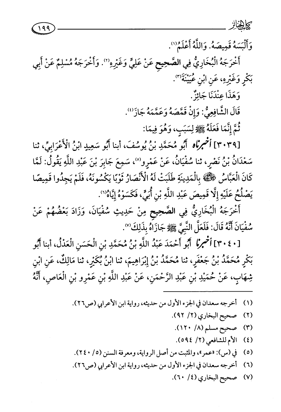 [3039] أخبرناه أَبُو مُحَمَّدِ بْنُ يُوسُفَ، أبنا أَبُو سَعِيدٍ ابْنُ الْأَعْرَابِيِّ، ثنا سَعْدَانُ بْنُ نَصْرٍ، ثنا سُفْيَانُ، عَنْ عَمْرٍو (¬5)، سَمِعَ جَابِرَ بْنَ عَبْدِ اللَّهِ يَقُولُ: لَمَّا كَانَ الْعَبَّاسُ - رضي الله عنه - بِالْمَدِينَةِ طَلَبَتْ لَهُ الأَنْصَارُ ثَوْبًا يَكْسُونَهُ، فَلَمْ يَجِدُوا قَمِيصًا يَصْلُحُ عَلَيْهِ إِلَّا قَمِيصَ عَبْدِ اللَّهِ بْنِ أُبَيٍّ، فَكَسَوْهُ إِيَّاهُ (¬6).