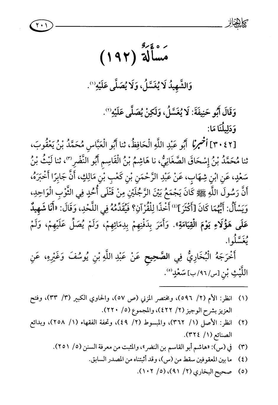 [3042] أخبرنا أَبُو عَبْدِ اللَّهِ الْحَافِظُ، ثنا أَبُو الْعَبَّاسِ مُحَمَّدُ بْنُ يَعْقُوبَ، ثنا مُحَمَّدُ بْنُ إِسْحَاقَ الصَّغَانِيُّ، نا هَاشِمُ بْنُ الْقَاسِمِ أَبُو النَّضْرِ (¬3)، ثنا لَيْثُ بْنُ سَعْدٍ، عَنِ ابْنِ شِهَابٍ، عَنْ عَبْدِ الرَّحْمَنِ بْنِ كَعْبِ بْنِ مَالِكٍ، أَنَّ جَابِرًا أَخْبَرَهُ، أَنَّ رَسُولَ اللَّهِ - صلى الله عليه وسلم - كَانَ يَجْمَعُ بَيْنَ الرَّجُلَيْنِ مِنْ قَتْلَى أُحُدٍ فِي الثَّوْبِ الْوَاحِدِ، وَيَسْأَلُ: أَيُّهُمَا كَانَ [أَكْثَرَ] (¬4) أَخْذًا لِلْقُرْآنِ؟ فَيُقَدِّمُهُ فِي اللَّحْدِ، وَقَالَ: "أَنَا شَهِيدٌ عَلَى هَؤُلَاءِ يَوْمَ الْقِيَامَةِ". وَأَمَرَ بِدَفْنِهِمْ بِدِمَائِهِمْ، وَلَمْ يُصَلِّ عَلَيْهِمْ، وَلَمْ يُغَسَّلُوا.