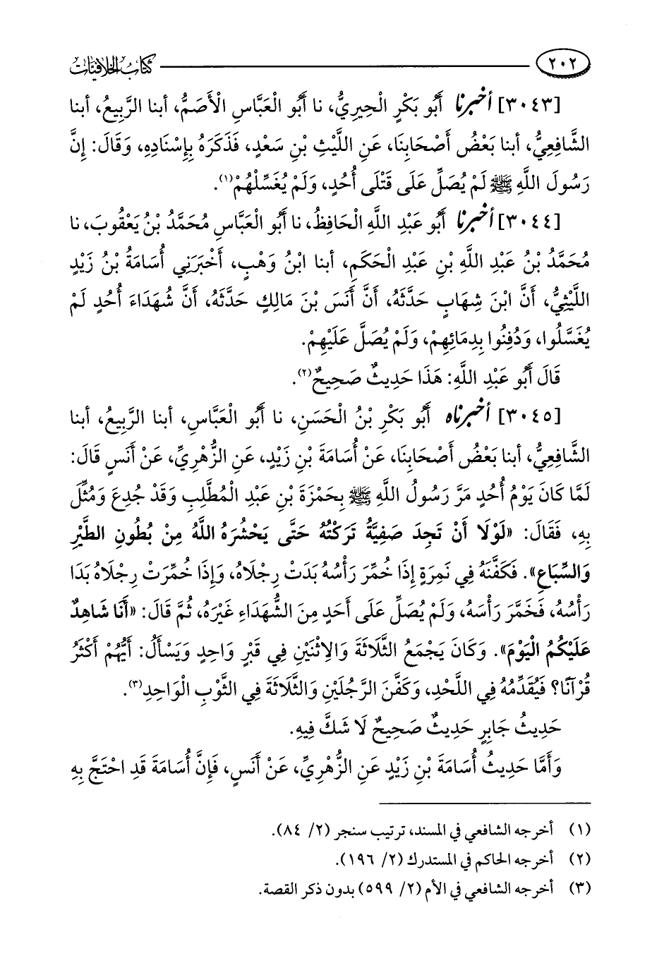 [3043] أخبرنا أَبُو بَكْرٍ الْحِيرِيُّ، نا أَبُو الْعَبَّاسِ الْأَصَمُّ، أبنا الرَّبِيعُ، أبنا الشَّافِعِيُّ، أبنا بَعْضُ أَصْحَابِنَا، عَنِ اللَّيْثِ بْنِ سَعْدٍ، فَذَكَرَهُ بِإِسْنَادِهِ، وَقَالَ: إِنَّ رَسُولَ اللَّهِ - صلى الله عليه وسلم - لَمْ يُصَلِّ عَلَى قَتْلَى أُحُدٍ، وَلَمْ يُغَسِّلْهُمْ (¬1).
