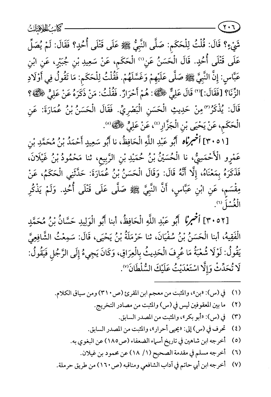 [3051] أخبرناه أَبُو عَبْدِ اللَّهِ الْحَافِظُ، نا أَبُو سَعِيدٍ أَحْمَدُ بْنُ مُحَمَّدِ بْنِ عَمْرٍو الْأَحْمَسِيُّ، نا الْحُسَيْنُ بْنُ حُمَيْدِ بْنِ الرَّبِيعِ، ثنا مَحْمُودُ بْنُ غَيْلَانَ، فَذَكَرَهُ بِمَعْنَاهُ، إِلَّا أَنَّهُ قَالَ: وَقَالَ الْحَسَنُ بْنُ عُمَارَةَ: حَدَّثَنِي الْحَكَمُ، عَنْ مِقْسَمٍ، عَنِ ابْنِ عَبَّاسٍ، أَنَّ النَّبِيَّ - صلى الله عليه وسلم - صَلَّى عَلَى قَتْلَى أُحُدٍ. وَلَمْ يَذْكُرِ الْغُسْلَ (¬6).
