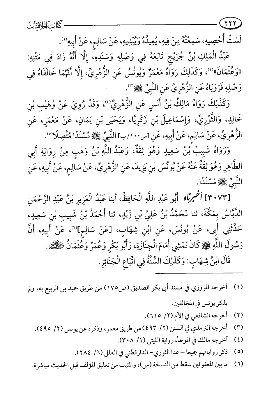 [3073] أخبرناه أَبُو عَبْدِ اللَّهِ الْحَافِظُ، أبنا عَبْدُ الْعَزِيزِ بْنُ عَبْدِ الرَّحْمَنِ الدَّبَّاسُ بِمَكَّةَ، ثنا مُحَمَّدُ بْنُ عَلِيِّ بْنِ زَيْدٍ، ثنا أَحْمَدُ بْنُ شَبِيبِ بْنِ سَعِيدٍ، حَدَّثَنِي أَبِي، عَنْ يُونُسَ، عَنِ ابْنِ شِهَابٍ، [عَنْ سَالِمٍ] (¬6)، عَنْ أَبِيهِ، أَنَّ رَسُولَ اللَّهِ - صلى الله عليه وسلم - كَانَ يَمْشِي أَمَامَ الْجِنَازَةِ، وَأَبُو بَكْرٍ وَعُمَرُ وَعُثْمَانُ - رضي الله عنهما -.