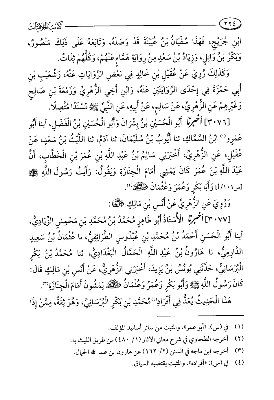 [3077] أخبرنا الْأُسْتَاذُ أَبُو طَاهِرٍ مُحَمَّدُ بْنُ مُحَمَّدِ بْنِ مَحْمِشٍ الزِّيَادِيُّ، أبنا أَبُو الْحَسَنِ أَحْمَدُ بْنُ مُحَمَّدِ بْنِ عُبْدُوسٍ الطَّرَائِفِيُّ، نا عُثْمَانُ بْنُ سَعِيدٍ الدَّارِمِيُّ، نا هَارُونُ بْنُ عَبْدِ اللَّهِ الْحَمَّالُ الْبَغْدَادِيُّ، ثنا مُحَمَّدُ بْنُ بَكْرٍ الْبُرْسَانِيُّ، حَدَّثَنِي يُونُسُ بْنُ يَزِيدَ، أَخْبَرَنِي الزُّهْرِيُّ، عَنْ أَنَسِ بْنِ مَالِكٍ قَالَ: كَانَ رَسُولُ اللَّهِ - صلى الله عليه وسلم - وَأَبُو بَكْرٍ وَعُمَرُ وَعُثْمَانُ - رضي الله عنهم - يَمْشُونَ أَمَامَ الْجِنَازَةِ (¬3).