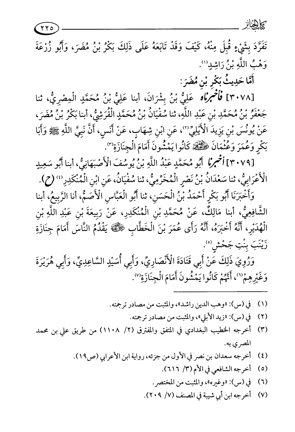 [3078] فأخبرناه عَلِيُّ بْنُ بِشْرَانَ، أبنا عَلِيُّ بْنُ مُحَمَّدٍ الْمِصْرِيُّ، ثنا جَعْفَرُ بْنُ مُحَمَّدِ بْنِ عَبْدِ اللَّهِ، ثنا سُفْيَانُ بْنُ مُحَمَّدٍ الْقُرَشِيُّ، أبنا بَكْرُ بْنُ مُضَرَ، عَنْ يُونُسَ بْنِ يَزِيدَ الْأَيْلِيِّ (¬2)، عَنِ ابْنِ شِهَابٍ، عَنْ أَنَسٍ، أَنَّ نَبِيَّ اللَّهِ - صلى الله عليه وسلم - وَأَبَا بَكْرٍ وَعُمَرَ وَعُثْمَانَ - رضي الله عنهم - كَانُوا يَمْشُونَ أَمَامَ الْجِنَازَةِ (¬3).
