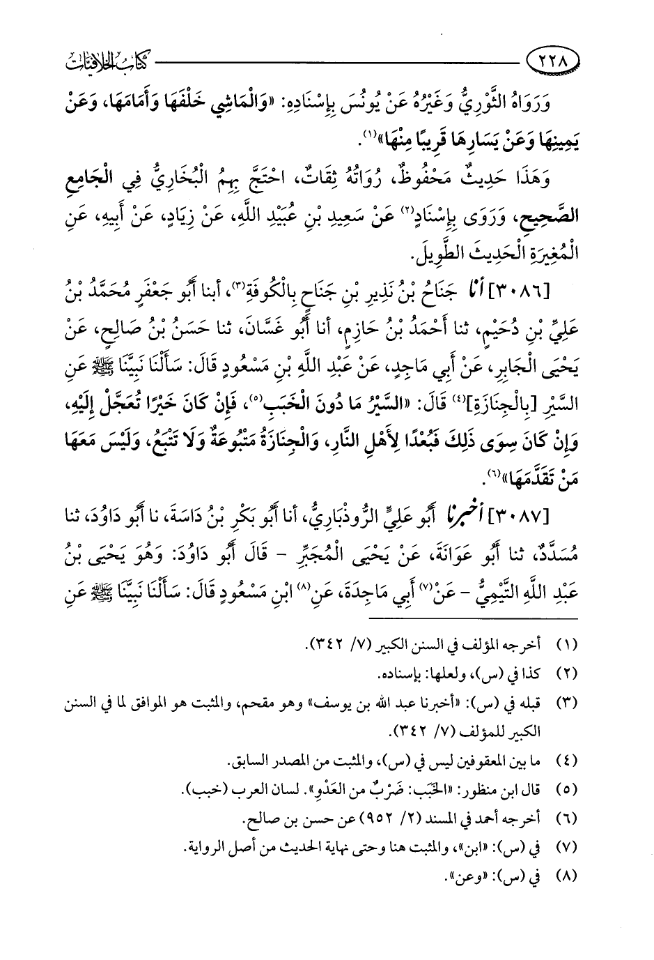 [3086] أنا جَنَاحُ بْنُ نَذِيرِ بْنِ جَنَاحٍ بِالْكُوفَةِ (¬3)، أبنا أَبُو جَعْفَرٍ مُحَمَّدُ بْنُ عَلِيِّ بْنِ دُحَيْمٍ، ثنا أَحْمَدُ بْنُ حَازِمٍ، أنا أَبُو غَسَّانَ، ثنا حَسَنُ بْنُ صَالِحٍ، عَنْ يَحْيَى الْجَابِرِ، عَنْ أَبِي مَاجِدٍ، عَنْ عَبْدِ اللَّهِ بْنِ مَسْعُودٍ قَالَ: سَأَلْنَا نَبِيَّنَا - صلى الله عليه وسلم - عَنِ السَّيْرِ [بِالْجِنَازَةِ] (¬4) قَالَ: "السَّيْرُ مَا دُونَ الْخَبَبِ (¬5)، فَإِنْ كَانَ خَيْرًا تُعَجَّلْ إِلَيْهِ، وَإِنْ كَانَ سِوَى ذَلِكَ فَبُعْدًا لِأَهْلِ النَّارِ، وَالْجِنَازَةُ مَتْبُوعَةٌ وَلَا تَتْبَعُ، وَلَيْسَ مَعَهَا مَنْ تَقَدَّمَهَا" (¬6).