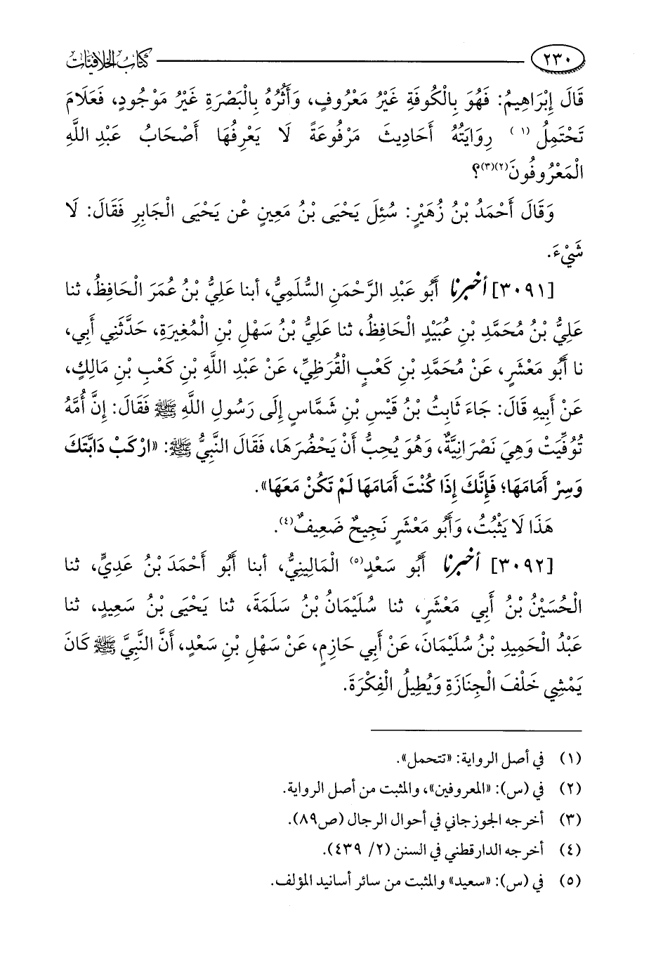 [3091] أخبرنا أَبُو عَبْدِ الرَّحْمَنِ السُّلَمِيُّ، أبنا عَلِيُّ بْنُ عُمَرَ الْحَافِظُ، ثنا عَلِيُّ بْنُ مُحَمَّدِ بْنِ عُبَيْدٍ الْحَافِظُ، ثنا عَلِيُّ بْنُ سَهْلِ بْنِ الْمُغِيرَةِ، حَدَّثَنِي أَبِي، نا أَبُو مَعْشَرٍ، عَنْ مُحَمَّدِ بْنِ كَعْبٍ الْقُرَظِيِّ، عَنْ عَبْدِ اللَّهِ بْنِ كَعْبِ بْنِ مَالِكٍ، عَنْ أَبِيهِ قَالَ: جَاءَ ثَابِتُ بْنُ قَيْسِ بْنِ شَمَّاسٍ إِلَى رَسُولِ اللَّهِ - صلى الله عليه وسلم - فَقَالَ: إِنَّ أُمَّهُ تُوُفِّيَتْ وَهِيَ نَصْرَانِيَّةٌ، وَهُوَ يُحِبُّ أَنْ يَحْضُرَهَا، فَقَالَ النَّبِيُّ - صلى الله عليه وسلم -: "ارْكَبْ دَابَّتَكَ وَسِرْ أَمَامَهَا؛ فَإِنَّكَ إِذَا كُنْتَ أَمَامَهَا لَمْ تَكُنْ مَعَهَا".