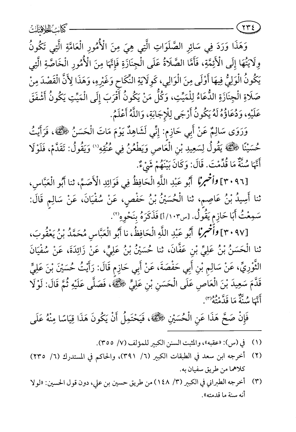 [3097] وأخبرنا أَبُو عَبْدِ اللَّهِ الْحَافِظُ، نا أَبُو الْعَبَّاسِ مُحَمَّدُ بْنُ يَعْقُوبَ، ثنا الْحَسَنُ بْنُ عَلِيِّ بْنِ عَفَّانَ، ثنا حُسَيْنُ بْنُ عَلِيٍّ، عَنْ زَائِدَةَ، عَنْ سُفْيَانَ الثَّوْرِيِّ، عَنْ سَالِمِ بْنِ أَبِي حَفْصَةَ، عَنْ أَبِي حَازِمٍ قَالَ: رَأَيْتُ حُسَيْنَ بْنَ عَلِيٍّ قَدَّمَ سَعِيدَ بْنَ الْعَاصِ عَلَى الْحَسَنِ بْنِ عَلِيٍّ - رضي الله عنه -، فَصَلَّى عَلَيْهِ ثُمَّ قَالَ: لَوْلَا أَنَّهَا سُنَّةٌ مَا قَدَّمْتُهُ (¬3).