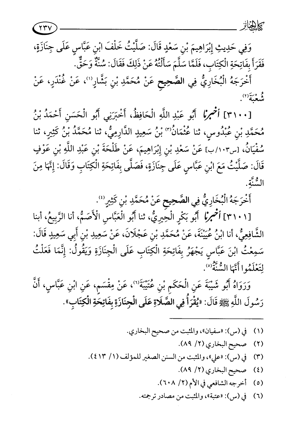 [3100] أخبرنا أَبُو عَبْدِ اللَّهِ الْحَافِظُ، أَخْبَرَنِي أَبُو الْحَسَنِ أَحْمَدُ بْنُ مُحَمَّدِ بْنِ عُبْدُوسٍ، ثنا عُثْمَانُ (¬3) بْنُ سَعِيدٍ الدَّارِمِيُّ، ثنا مُحَمَّدُ بْنُ كَثِيرٍ، ثنا سُفْيَانُ، عَنْ سَعْدِ بْنِ إِبْرَاهِيمَ، عَنْ طَلْحَةَ بْنِ عَبْدِ اللَّهِ بْنِ عَوْفٍ قَالَ: صَلَّيْتُ مَعَ ابْنِ عَبَّاسٍ عَلَى جِنَازَةٍ، فَصَلَّى بِفَاتِحَةِ الْكِتَابِ وَقَالَ: إِنَّهَا مِنَ السُّنَّةِ.