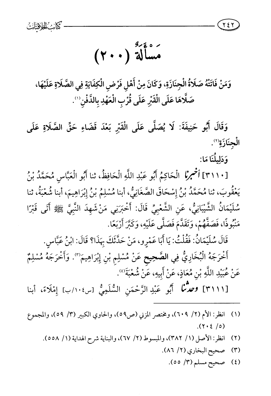 [3110] أخبرنا الْحَاكِمُ أَبُو عَبْدِ اللَّهِ الْحَافِظُ، ثنا أَبُو الْعَبَّاسِ مُحَمَّدُ بْنُ يَعْقُوبَ، ثنا مُحَمَّدُ بْنُ إِسْحَاقَ الصَّغَانِيُّ، أبنا مُسْلِمُ بْنُ إِبْرَاهِيمَ، أبنا شُعْبَةُ، ثنا سُلَيْمَانُ الشَّيْبَانِيُّ، عَنِ الشَّعْبِيِّ قَالَ: أَخْبَرَنِي مَنْ شَهِدَ النَّبِيَّ - صلى الله عليه وسلم - أَتَى قَبْرًا مَنْبُوذًا، فَصَفَّهُمْ، وَتَقَدَّمَ فَصَلَّى عَلَيْهِ، وَكَبَّرَ أَرْبَعًا.