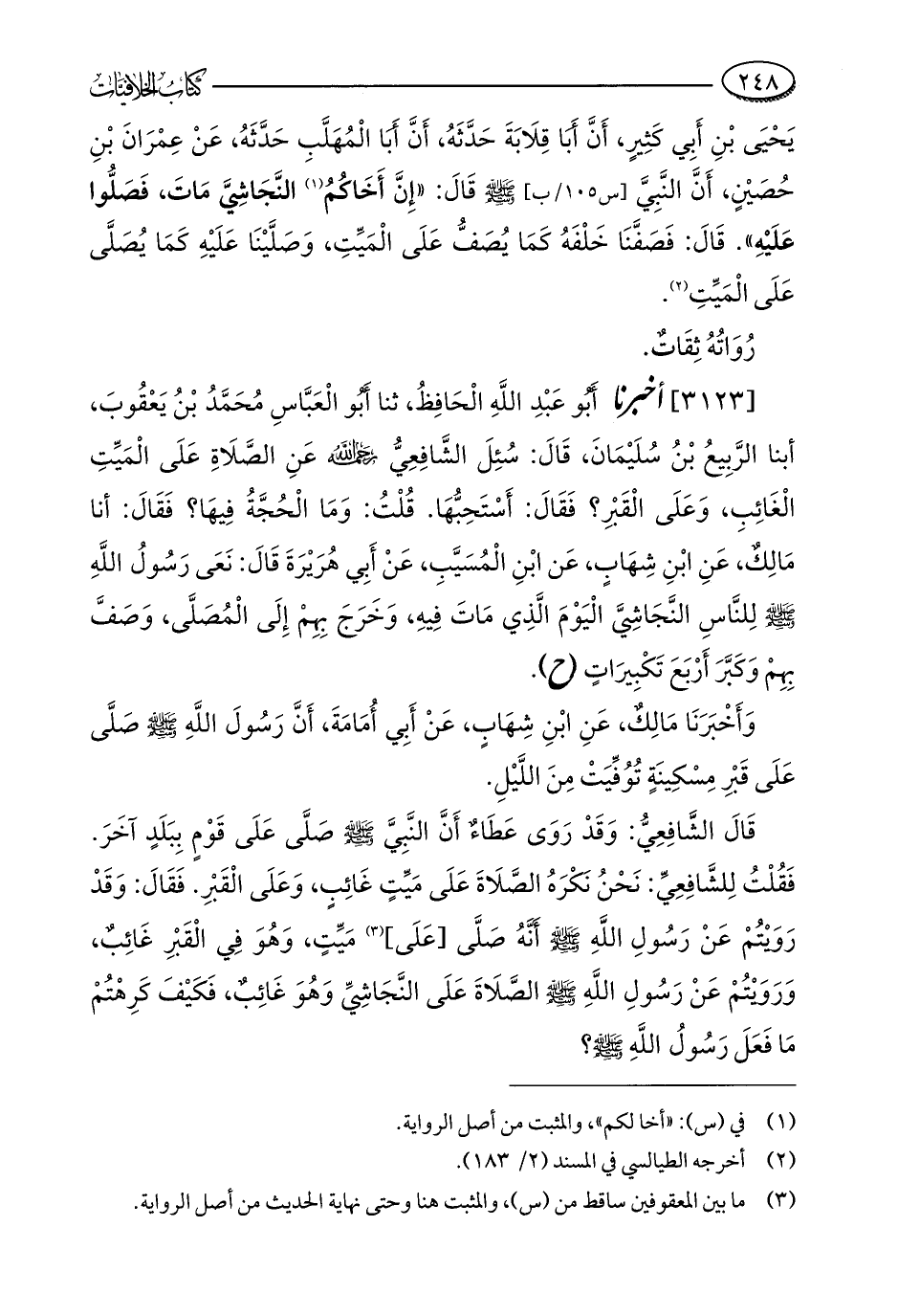 [3123] أخبرنا أَبُو عَبْدِ اللَّهِ الْحَافِظُ، ثنا أَبُو الْعَبَّاسِ مُحَمَّدُ بْنُ يَعْقُوبَ، أبنا الرَّبِيعُ بْنُ سُلَيْمَانَ، قَالَ: سُئِلَ الشَّافِعِيُّ - رحمه الله - عَنِ الصَّلَاةِ عَلَى الْمَيِّتِ الْغَائِبِ، وَعَلَى الْقَبْرِ؟ فَقَالَ: أَسْتَحِبُّهَا. قُلْتُ: وَمَا الْحُجَّةُ فِيهَا؟ فَقَالَ: أنا مَالِكٌ، عَنِ ابْنِ شِهَابٍ، عَن ابْنِ الْمُسَيَّبِ، عَنْ أَبِي هُرَيْرَةَ قَالَ: نَعَى رَسُولُ اللَّهِ - صلى الله عليه وسلم - لِلنَّاسِ النَّجَاشِيَّ الْيَوْمَ الَّذِي مَاتَ فِيهِ، وَخَرَجَ بِهِمْ إِلَى الْمُصَلَّى، وَصَفَّ بِهِمْ وَكَبَّرَ أَرْبَعَ تَكْبِيرَاتٍ (ح).
