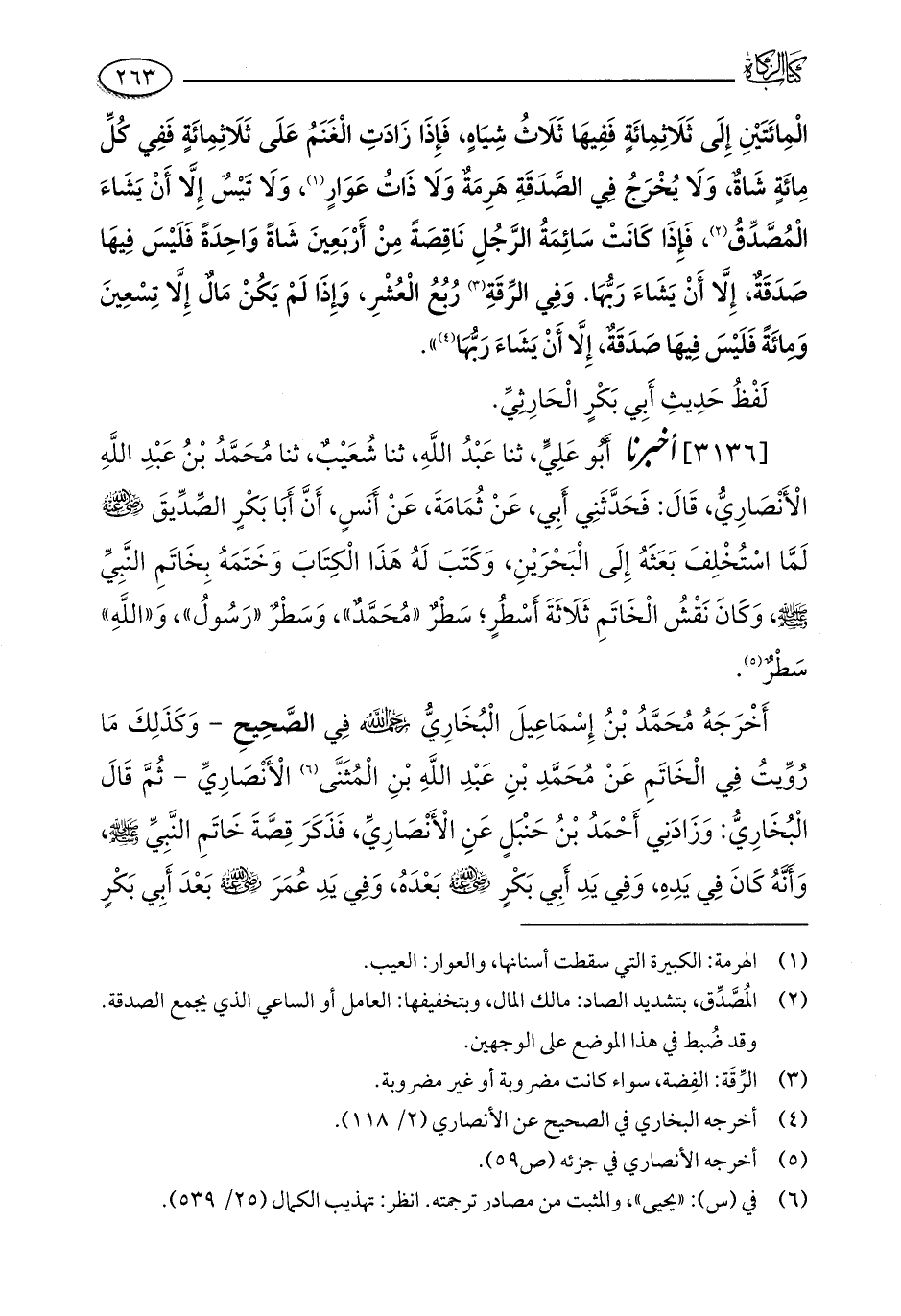 أَخْرَجَهُ مُحَمَّدُ بْنُ إِسْمَاعِيلَ الْبُخَارِيُّ - رحمه الله - فِي الصَّحِيحِ - وَكَذَلِكَ مَا رُوِّيتُ فِي الْخَاتَمِ عَنْ مُحَمَّدِ بْنِ عَبْدِ اللَّهِ بْنِ الْمُثَنَّى (¬6) الْأَنْصَارِيِّ - ثُمَّ قَالَ الْبُخَارِيُّ: وَزَادَنِي أَحْمَدُ بْنُ حَنْبَلٍ عَنِ الْأَنْصَارِيِّ، فَذَكَرَ قِصَّةَ خَاتَمِ النَّبِيِّ - صلى الله عليه وسلم -، وَأَنَّهٌ كَانَ فِي يَدِهِ، وَفِي يَدِ أَبِي بَكْرٍ - رضي الله عنه - بَعْدَهُ، وَفِي يَدِ عُمَرَ - رضي الله عنه - بَعْدَ أَبِي بَكْرٍ