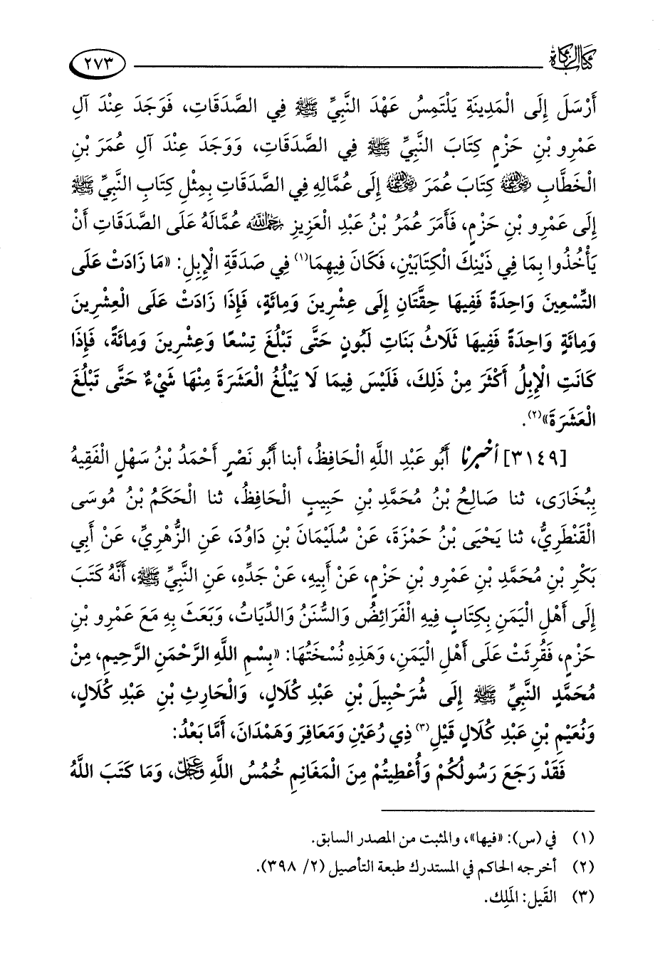 [3149] أخبرنا أَبُو عَبْدِ اللَّهِ الْحَافِظُ، أبنا أَبُو نَصْرٍ أَحْمَدُ بْنُ سَهْلٍ الْفَقِيهُ بِبُخَارَى، ثنا صالِحُ بْنُ مُحَمَّدِ بْنِ حَبِيبٍ الْحَافِظُ، ثنا الْحَكَمُ بْنُ مُوسَى الْقَنْطَرِيُّ، ثنا يَحْيَى بْنُ حَمْزَةَ، عَنْ سلَيْمَانَ بْنِ دَاوُدَ، عَنِ الزُّهْرِيِّ، عَنْ أَبِي بَكْرِ بْنِ مُحَمَّدِ بْنِ عَمْرِو بْنِ حَزْمٍ، عَنْ أَبِيهِ، عَنْ جَدِّهِ، عَنِ النَّبِيِّ - صلى الله عليه وسلم -، أَنَّهُ كَتَبَ إِلَى أَهْلِ الْيَمَنِ بِكِتَابٍ فِيهِ الْفَرَائِضُ وَالسُّنَنُ وَالدِّيَاتُ، وَبَعَثَ بِهِ مَعَ عَمْرِو بْنِ حَزْمٍ، فَقُرِئَتْ عَلَى أَهْلِ الْيَمَنِ، وَهَذِهِ نُسْخَتُهَا: "بِسْمِ اللَّهِ الرَّحْمَنِ الرَّحِيمِ، مِنْ مُحَمَّدٍ النَّبِيِّ - صلى الله عليه وسلم - إِلَى شُرَحْبِيلَ بْنِ عَبْدِ كُلَالٍ، وَالْحَارِثِ بْنِ عَبْدِ كُلَالٍ، وَنُعَيْمِ بْنِ عَبْدِ كُلَالٍ قَيْلِ (¬3) ذِي رُعَيْنِ وَمَعَافِرَ وَهَمْدَانَ، أَمَّا بَعْدُ: