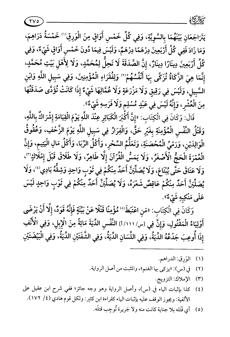 قَالَ: وَكَانَ فِي الْكِتَابِ: "إِنَّ أَكبَرَ الْكَبَائِرِ عِنْدَ اللَّهِ يَوْمَ الْقِيَامَةِ إِشْرَاكٌ بِاللَّهِ، وَقَتْلُ النَّفْسِ الْمُؤْمِنَةِ بِغَيْرِ حَقٍّ، وَالْفِرَارُ فِي سَبِيلِ اللَّهِ يَوْمَ الزَّحْفِ، وَعُقُوقُ الْوَالِدَيْنِ، وَرَمْيُ الْمُحْصَنَةِ، وَتَعَلُّمُ السِّحْرِ، وَأَكْلُ الرِّبَا، وَأَكْلُ مَالِ الْيَتِيمِ، وَإِنَّ الْعُمْرَةَ الْحَجُّ الْأَصْغَرُ، وَلَا يَمَسُّ الْقُرْآنَ إِلَّا طَاهِرٌ، وَلَا طَلَاقَ قَبْلَ إِمْلَاكٍ (¬3)، وَلَا عَتَاقَ حَتَّى يُبْتَاعَ، وَلَا يُصَلِّيَنَّ أَحَدٌ مِنْكُمْ فِي ثَوْبٍ وَاحِدٍ وَشِقُّهُ بَادِي (¬4)، وَلَا يُصَلِّيَنَّ أَحَدٌ مِنْكُمْ عَاقِصٌ شَعْرَهُ، وَلَا يُصَلِّيَنَّ أَحَدٌ مِنْكُمْ في ثَوْبٍ وَاحِدٍ لَيْسَ عَلَى مَنْكِبِهِ شَيْءٌ".