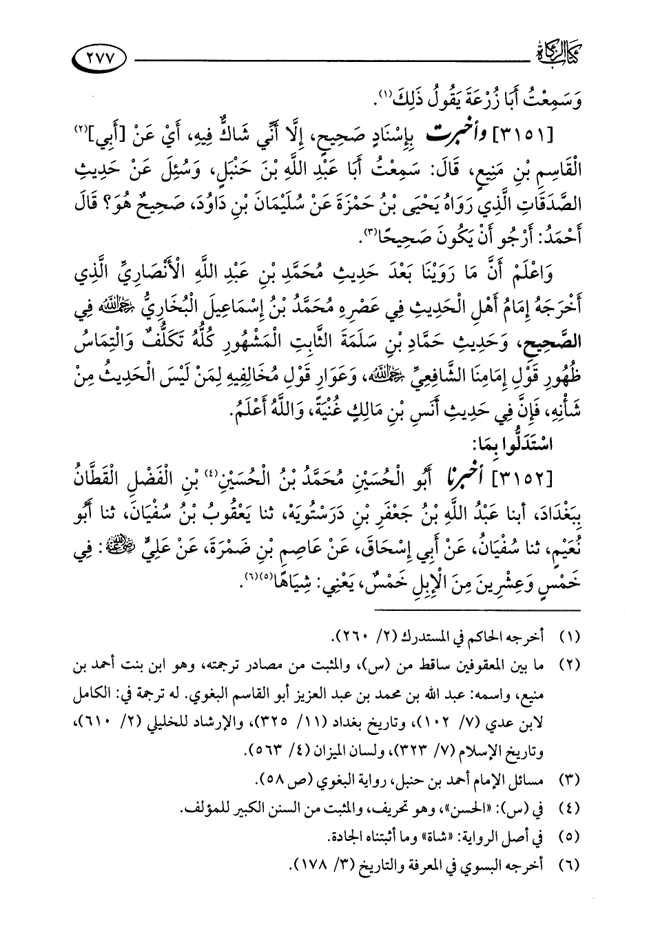 [3151] وأخبرت بِإِسْنَادٍ صحِيحٍ، إِلَّا أَنِّي شَاكٌّ فِيهِ، أَيْ عَنْ [أَبِي] (¬2) الْقَاسِمِ بْنِ مَنِيعٍ، قَالَ: سَمِعْتُ أَبَا عَبْدِ اللَّهِ بْنَ حَنْبَلٍ، وَسُئِلَ عَنْ حَدِيثِ الصَّدَقَاتِ الَّذِي رَوَاهُ يَحْيَى بْنُ حَمْزَةَ عَنْ سُلَيْمَانَ بْنِ دَاوُدَ، صَحِيحٌ هُوَ؟ قَالَ أَحْمَدُ: أَرْجُو أَنْ يَكُونَ صَحِيحًا (¬3).