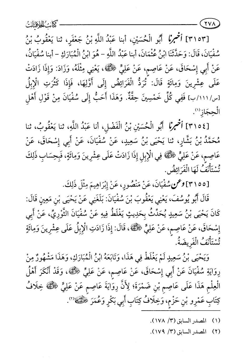 [3153] أخبرنا أَبُو الْحُسَيْنِ، أبنا عَبْدُ اللَّهِ بْنُ جَعْفَرٍ، ثنا يَعْقُوبُ بْنُ سُفْيَانَ، قَالَ: وَحَدَّثَنَا ابْنُ عُثْمَانَ، أبنا عَبْدُ اللَّهِ - هُوَ ابْنُ الْمُبَارَكِ - أبنا سُفْيَانُ، عَنْ أَبِي إِسْحَاقَ، عَنْ عَاصِمٍ، عَنْ عَلِيٍّ - رضي الله عنه -، يَعْنِي مِثْلَهُ، وَزَادَ: وَإِذَا زَادَتْ عَلَى عِشْرِينَ وَمِائَةٍ قَالَ: تُرَدُّ الْفَرَائِضُ إِلَى أَوَّلِهَا، فَإِذَا كَثُرَتِ الْإِبِلُ فَفِي كُلِّ خَمْسِينَ حِقَّةٌ. وَهَذَا أَحَبُّ إِلَى سُفْيَانَ مِنْ قَوْلِ أَهْلِ الْحِجَازِ (¬1).