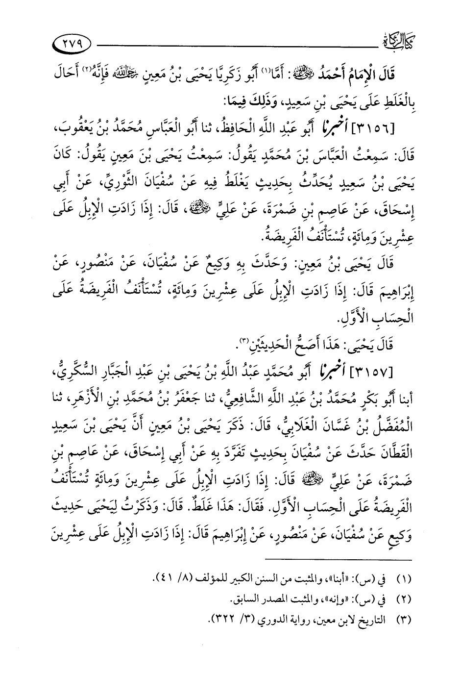 [3157] أخبرنا أَبُو مُحَمَّدٍ عَبْدُ اللَّهِ بْنُ يَحْيَى بْنِ عَبْدِ الْجَبَّارِ السُّكَّرِيُّ، أبنا أَبُو بَكْرٍ مُحَمَّدُ بْنُ عَبْدِ اللَّهِ الشَّافِعِيُّ، ثنا جَعْفَرُ بْنُ مُحَمَّدِ بْنِ الْأَزْهَرِ، ثنا الْمُفَضَّلُ بْنُ غَسَّانَ الْغَلَابِيُّ، قَالَ: ذَكَرَ يَحْيَى بْنُ مَعِينٍ أَنَّ يَحْيَى بْنَ سَعِيدٍ الْقَطَّانَ حَدَّثَ عَنْ سُفْيَانَ بِحَدِيثٍ تَفَرَّدَ بِهِ عَنْ أَبِي إِسْحَاقَ، عَنْ عَاصِمِ بْنِ ضَمْرَةَ، عَنْ عَلِيٍّ - رضي الله عنه - قَالَ: إِذَا زَادَتِ الْإِبِلُ عَلَى عِشْرِينَ وَمِائَةٍ تُسْتَأْنَفُ الْفَرِيضَةُ عَلَى الْحِسَابِ الْأَوَّلِ. فَقَالَ: هَذَا غَلَطٌ. قَالَ: وَذَكَرْتُ لِيَحْيَى حَدِيثَ وَكِيعٍ عَنْ سُفْيَانَ، عَنْ مَنْصُورٍ، عَنْ إِبْرَاهِيمَ قَالَ: إِذَا زَادَتِ الْإِبِلُ عَلَى عِشْرِينَ