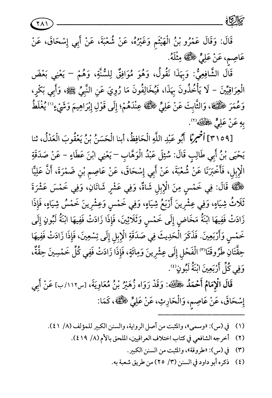 [3159] أخبرنا أَبُو عَبْدِ اللَّهِ الْحَافِظُ، أبنا الْحَسَنُ بْنُ يَعْقُوبَ الْعَدْلُ، ثنا يَحْيَى بْنُ أَبِي طَالِبٍ قَالَ: سُئِلَ عَبْدُ الْوَهَّابِ - يَعْنِي ابْنَ عَطَاءٍ - عَنْ صَدَقَةِ الْإِبِلِ، فَأَخْبَرَنَا عَنْ شُعْبَةَ، عَنْ أَبِي إِسْحَاقَ، عَنْ عَاصِمِ بْنِ ضَمْرَةَ، أَنَّ عَلِيًّا - رضي الله عنه - قَالَ: فِي خَمْسٍ مِنَ الْإِبِلِ شَاةٌ، وَفِي عَشْرٍ شَاتَانِ، وَفِي خَمْسَ عَشْرَةَ ثَلَاثُ شِيَاهٍ، وَفِي عِشْرِينَ أَرْبَعُ شِيَاهٍ، وَفِي خَمْسٍ وَعِشْرِينَ خَمْسُ شِيَاهٍ، فَإِذَا زَادَتْ فَفِيهَا ابْنَةُ مَخَاضٍ إِلَى خَمْسٍ وَثَلَاثِينَ، فَإِذَا زَادَتْ فَفِيهَا ابْنَةُ لَبُونٍ إِلَى خَمْسٍ وَأَرْبَعِينَ. فَذَكَرَ الْحَدِيثَ فِي صَدَقَةِ الْإِبِلِ إِلَى تِسْعِينَ، فَإِذَا زَادَتْ فَفِيهَا حِقَّتَانِ طَرُوقَتَا (¬3) الْفَحْلِ إِلَى عِشْرِينَ وَمِائَةٍ، فَإِذَا زَادَتْ فَفِي كُلِّ خَمْسِينَ حِقَّةٌ، وَفِي كُلِّ أَرْبَعِينَ ابْنَةُ لَبُونٍ (¬4).