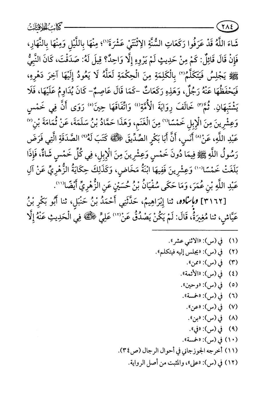 شَاءَ اللَّهُ قَدْ عَرَفُوا رَكَعَاتِ السُّنَّةِ الِاثْنَتَيْ عَشْرَةَ (¬1)؛ مِنْهَا بِاللَّيْلِ وَمِنْهَا بِالنَّهَارِ، فَإِنْ قَالَ قَائِلٌ: كَمْ مِنْ حَدِيثٍ لَمْ يَرْوِهِ إِلَّا وَاحِدٌ؟ قِيلَ لَهُ: صَدَقْتَ، كَانَ النَّبِيُّ - صلى الله عليه وسلم - يَجْلِسُ فَيَتَكَلَّمُ (¬2) بِالْكَلِمَةِ مِنَ الْحِكْمَةِ لَعَلَّهُ لَا يَعُودُ إِلَيْهَا آخِرَ دَهْرِهِ، فَيَحْفَظُهَا عَنْهُ رَجُلٌ، وَهَذِهِ رَكَعَاتٌ - كَمَا قَالَ عَاصِمٌ - كَانَ يُدَاوِمُ عَلَيْهَا، فَلَا يَشْتَبِهَانِ. ثُمَّ (¬3) خَالَفَ رِوَايَةَ الْأُمَّةِ (¬4) وَاتِّفَاقَهَا حِينَ (¬5) رَوَى أَنَّ فِي خَمْسٍ وَعِشْرِينَ مِنَ الْإِبِلِ خَمْسًا (¬6) مِنَ الْغَنَمِ، وَهَذَا حَمَّادُ بْنُ سَلَمَةَ، عَنْ ثُمَامَةَ بْنِ (¬7) عَبْدِ اللَّهِ، عَنْ (¬8) أَنَسٍ، أَنَّ أَبَا بَكْرٍ الصِّدِّيقَ - رضي الله عنه - كَتَبَ لَهُ (¬9) الصَّدَقَةِ الَّتِي فَرَضَ رَسُولُ اللَّهِ - صلى الله عليه وسلم - فِيمَا دُونَ خَمْسٍ وَعِشْرِينَ مِنَ الْإِبِلِ، فِي كُلِّ خَمْسٍ شَاةٌ، فَإِذَا بَلَغَتْ خَمْسًا (¬10) وَعِشْرِينَ فَفِيهَا ابْنَةُ مَخَاضٍ، وَكَذَلِكَ حِكَايَةُ الزُّهْرِيِّ عَنْ آلِ عَبْدِ اللَّهِ بْنِ عُمَرَ، وَمَا حَكَى سُفْيَانُ بْنُ حُسَيْنٍ عَنِ الزُّهْرِيِّ أَيْضًا (¬11).