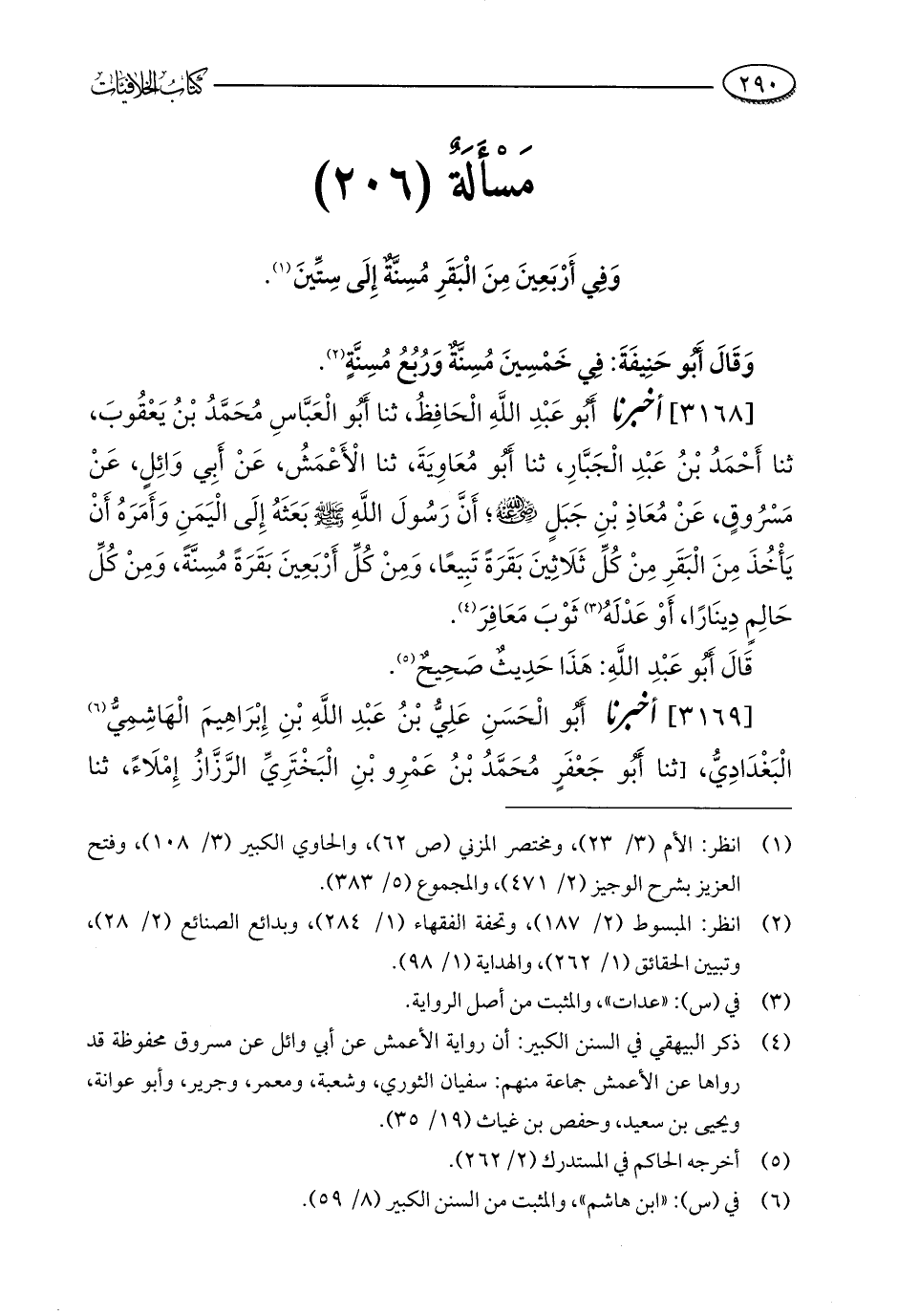 [3168] أخبرنا أَبُو عَبْدِ اللَّهِ الْحَافِظُ، ثنا أبُو الْعَبَّاسِ مُحَمَّدُ بْنُ يَعْقُوبَ، ثنا أَحْمَدُ بْنُ عَبْدِ الْجَبَّارِ، ثنا أَبُو مُعَاوِيَةَ، ثنا الْأَعْمَشُ، عَنْ أَبِي وَائِلٍ، عَنْ مَسْرُوقٍ، عَنْ مُعَاذِ بْنِ جَبَلٍ - رضي الله عنه -؛ أَنَّ رَسُولَ اللَّهِ - صلى الله عليه وسلم - بَعَثَهُ إِلَى الْيَمَنِ وَأَمَرَهُ أَنْ يَأْخُذَ مِنَ الْبَقَرِ مِنْ كُلِّ ثَلَاثِينَ بَقَرَةً تَبِيعًا، وَمِنْ كُلِّ أَرْبَعِينَ بَقَرَةً مُسِنَّةً، وَمِنْ كُلِّ حَالِمٍ دِينَارًا، أَوْ عَدْلَهُ (¬3) ثَوْبَ مَعَافِرَ (¬4).