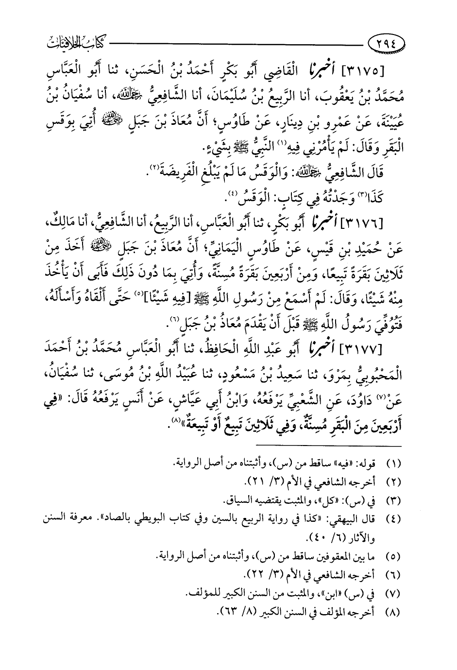 [3175] أخبرنا الْقَاضِي أَبُو بَكْرٍ أَحْمَدُ بْنُ الْحَسَنِ، ثنا أَبُو الْعَبَّاسِ مُحَمَّدُ بْنُ يَعْقُوبَ، أنا الرَّبِيعُ بْنُ سُلَيْمَانَ، أنا الشَّافِعِيُّ - رحمه الله -، أنا سُفْيَانُ بْنُ عُيَيْنَةَ، عَنْ عَمْرِو بْنِ دِينَارٍ، عَنْ طَاوُسٍ؛ أَنَّ مُعَاذَ بْنَ جَبَلٍ - رضي الله عنه - أُتِيَ بِوَقَسِ الْبَقَرِ وَقَالَ: لَمْ يَأْمُرْنِي فِيهِ (¬1) النَّبِيُّ - صلى الله عليه وسلم - بِشَيْءٍ.