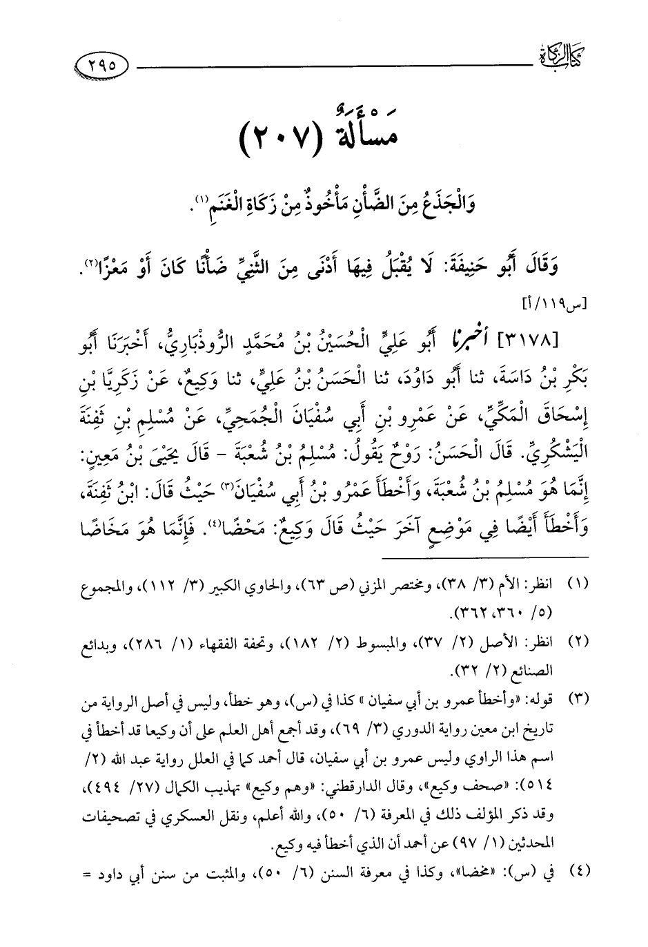 [3178] أخبرنا أَبُو عَلِيٍّ الْحُسَيْنُ بْنُ مُحَمَّدٍ الرُّوذْبَارِيُّ، أَخْبَرَنَا أَبُو بَكْرِ بْنُ دَاسَةَ، ثنا أَبُو دَاوُدَ، ثنا الْحَسَنُ بْنُ عَلِيٍّ، ثنا وَكِيعٌ، عَنْ زَكَرِيَّا بْنِ إِسْحَاقَ الْمَكِّيِّ، عَنْ عَمْرِو بْنِ أَبِي سُفْيَانَ الْجُمَحِيِّ، عَنْ مُسْلِمِ بْنِ ثَفِنَةَ الْيَشْكُرِيِّ. قَالَ الْحَسَنُ: رَوْحٌ يَقُولُ: مُسْلِمُ بْنُ شُعْبَةَ - قَالَ يَحْيَى بْنُ مَعِينٍ: إِنَّمَا هُوَ مُسْلِمُ بْنُ شُعْبَةَ، وَأَخْطَأَ عَمْرُو بْنُ أَبِي سُفْيَانَ (¬3) حَيْثُ قَالَ: ابْنُ ثَفِنَةَ، وَأَخْطَأَ أَيْضًا فِي مَوْضِعٍ آخَرَ حَيْثُ قَالَ وَكِيعٌ: مَحْضًا (¬4). فَإِنَّمَا هُوَ مَخَاضًا