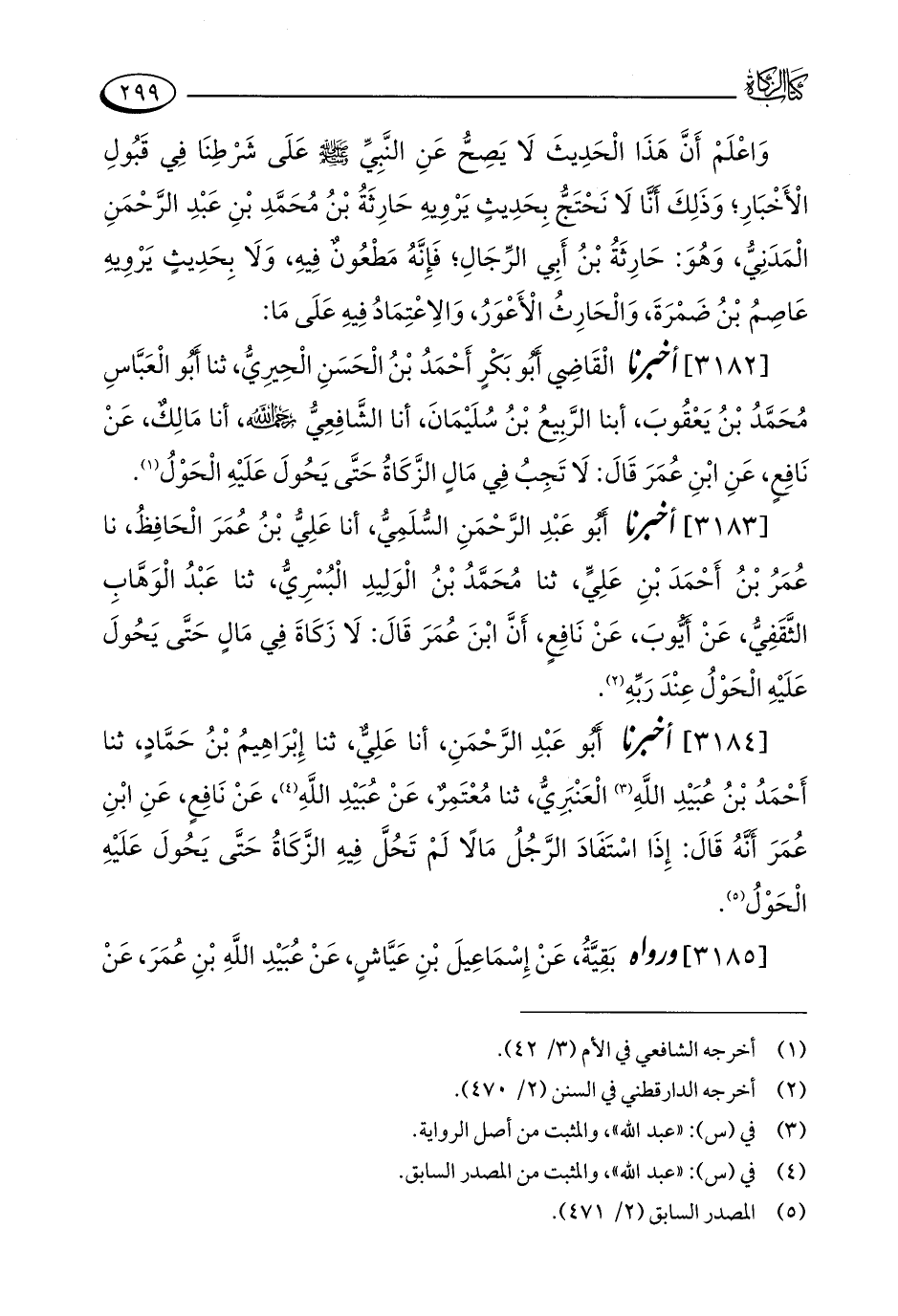 [3182] أخبرنا الْقَاضِي أَبُو بَكْرٍ أَحْمَدُ بْنُ الْحَسَنِ الْحِيرِيُّ، ثنا أَبُو الْعَبَّاسِ مُحَمَّدُ بْنُ يَعْقُوبَ، أبنا الرَّبِيعُ بْنُ سُلَيْمَانَ، أنا الشَّافِعِيُّ - رحمه الله -، أنا مَالِكٌ، عَنْ نَافِعٍ، عَنِ ابْنِ عُمَرَ قَالَ: لَا تَجِبُ فِي مَالٍ الزَّكَاةُ حَتَّى يَحُولَ عَلَيْهِ الْحَوْلُ (¬1).