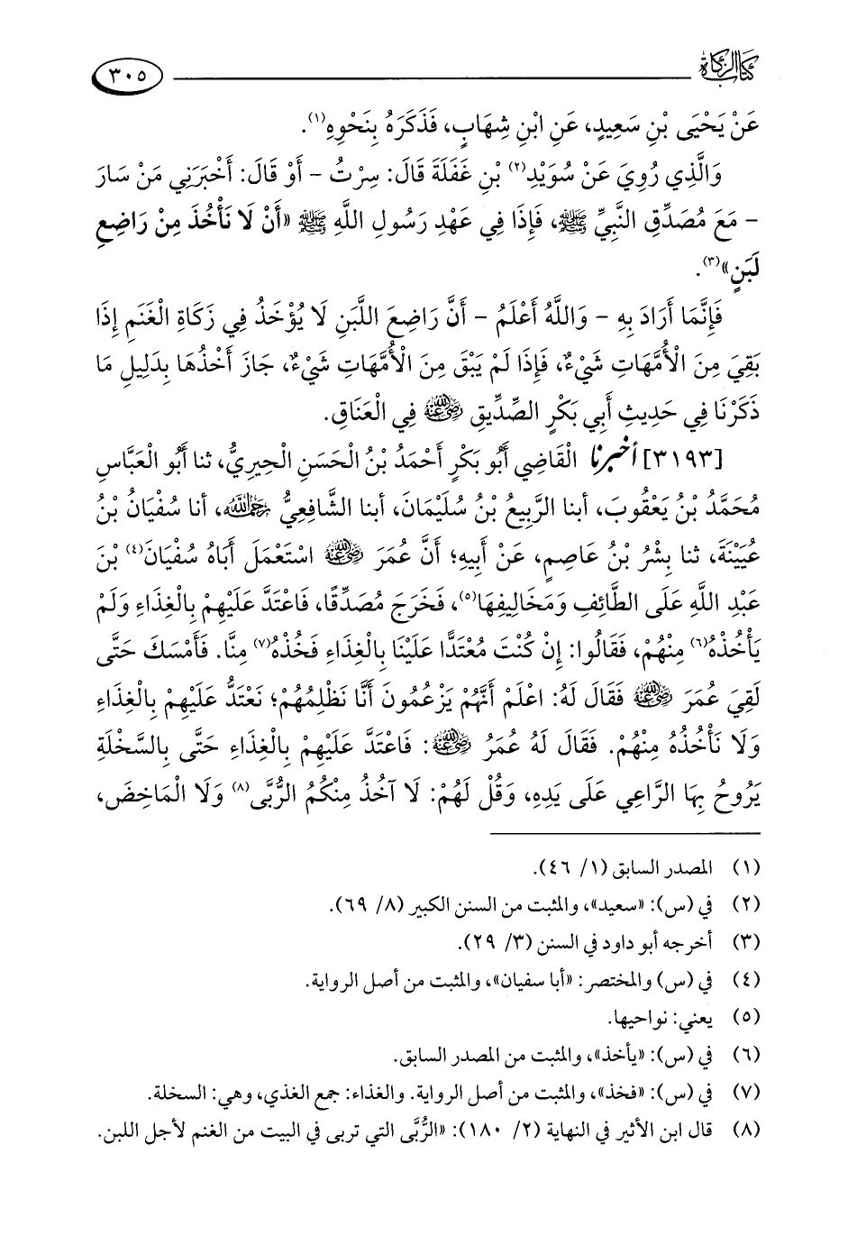 [3193] أخبرنا الْقَاضِي أَبُو بَكْرٍ أَحْمَدُ بْنُ الْحَسَنِ الْحِيرِيُّ، ثنا أَبُو الْعَبَّاسِ مُحَمَّدُ بْنُ يَعْقُوبَ، أبنا الرَّبِيعُ بْنُ سُلَيْمَانَ، أبنا الشَّافِعِيُّ - رحمه الله -، أنا سُفْيَانُ بْنُ عُيَيْنَةَ، ثنا بِشْرُ بْنُ عَاصِمٍ، عَنْ أَبِيهِ؛ أَنَّ عُمَرَ - رضي الله عنه - اسْتَعْمَلَ أَبَاهُ سُفْيَانَ (¬4) بْنَ عَبْدِ اللَّهِ عَلَى الطَّائِفِ وَمَخَالِيفِهَا (¬5)، فَخَرَجَ مُصَدِّقًا، فَاعْتَدَّ عَلَيْهِمْ بِالْغِذَاءِ وَلَمْ يَأْخُذْهُ (¬6) مِنْهُمْ، فَقَالُوا: إِنْ كُنْتَ مُعْتَدًّا عَلَيْنَا بِالْغِذَاءِ فَخُذْهُ (¬7) مِنَّا. فَأَمْسَكَ حَتَّى لَقِيَ عُمَرَ - رضي الله عنه - فَقَالَ لَهُ: اعْلَمْ أَنَّهُمْ يَزْعُمُونَ أنَا نَظْلِمُهُمْ؛ نَعْتَدُّ عَلَيْهِمْ بِالْغِذَاءِ وَلَا نَأْخُذُهُ مِنْهُمْ. فَقَالَ لَهُ عُمَرُ - رضي الله عنه -: فَاعْتَدَّ عَلَيْهِمْ بِالْغِذَاءِ حَتَّى بِالسَّخْلَةِ يَرُوحُ بِهَا الرَّاعِي عَلَى يَدِهِ، وَقُلْ لَهُمْ: لَا آخُذُ مِنْكُمُ الرُّبَّى (¬8) وَلَا الْمَاخِضَ،