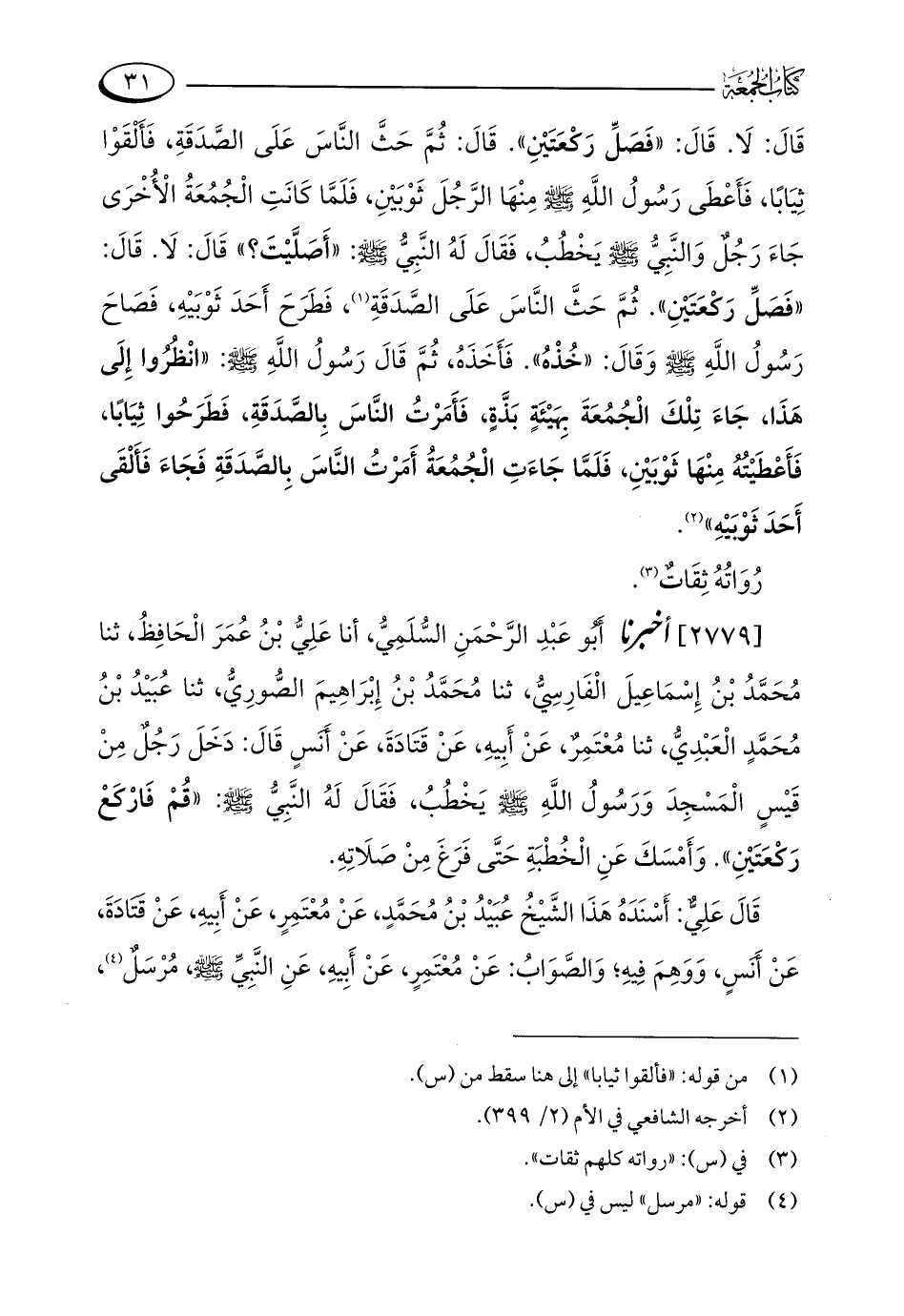 [2779] أخبرنا أَبُو عَبْدِ الرَّحْمَنِ السُّلَمِيُّ، أنا عَلِيُّ بْنُ عُمَرَ الْحَافِظُ، ثنا مُحَمَّدُ بْنُ إِسْمَاعِيلَ الْفَارِسِيُّ، ثنا مُحَمَّدُ بْنُ إِبْرَاهِيمَ الصُّورِيُّ، ثنا عُبَيْدُ بْنُ مُحَمَّدٍ الْعَبْدِيُّ، ثنا مُعْتَمِرٌ، عَنْ أَبِيهِ، عَنْ قَتَادَةَ، عَنْ أَنَسٍ قَالَ: دَخَلَ رَجُلٌ مِنْ قَيْسٍ الْمَسْجِدَ وَرَسُولُ اللَّهِ - صلى الله عليه وسلم - يَخْطُبُ، فَقَالَ لَهُ النَّبِيُّ - صلى الله عليه وسلم -: "قُمْ فَارْكَعْ رَكْعَتَيْنِ". وَأَمْسَكَ عَنِ الْخُطْبَةِ حَتَّى فَرَغَ مِنْ صَلَاتِهِ.
