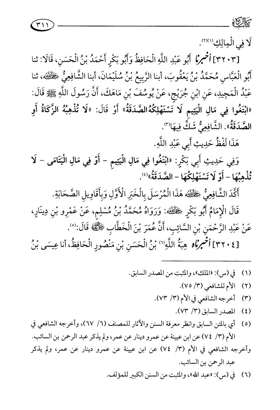 [3203] أخبرنا أَبُو عَبْدِ اللَّهِ الْحَافِظُ وَأَبُو بَكْرٍ أَحْمَدُ بْنُ الْحَسَنِ، قَالَا: ثنا أَبُو الْعَبَّاسِ مُحَمَّدُ بْنُ يَعْقُوبَ، أبنا الرَّبِيعُ بْنُ سُلَيْمَانَ، أبنا الشَّافِعِيُّ - رحمه الله -، ثنا عَبْدُ الْمَجِيدِ، عَنِ ابْنِ جُرَيْجٍ، عَنْ يُوسُفَ بْنِ مَاهَكَ، أَنَّ رَسُولَ اللَّهِ - صلى الله عليه وسلم - قَالَ: "ابْتَغُوا فِي مَالِ الْيَتِيمِ لَا تَسْتَهْلِكُهُ الصَّدَقَةُ" أَوْ قَالَ: "لَا تُذْهِبُهُ الزَّكَاةُ أَوِ الصَّدَقَةُ". الشَّافِعِيُّ شَكَّ فِيهَا (¬3).
