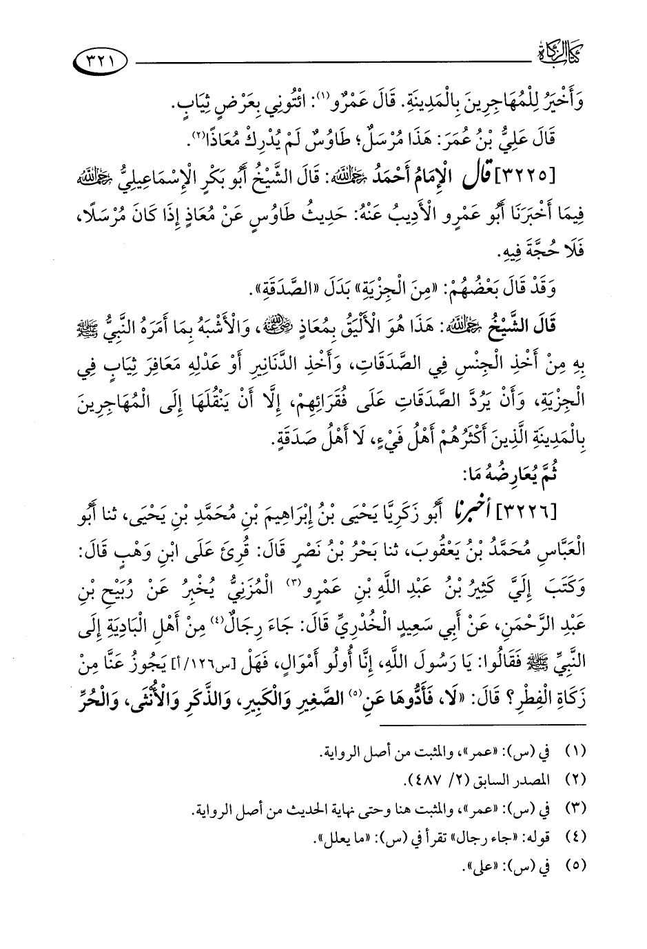 [3225] قال الْإِمَامُ أَحْمَدُ - رحمه الله -: قَالَ الشَّيْخُ أَبُو بَكْرٍ الْإِسْمَاعِيلِيُّ - رحمه الله - فِيمَا أَخْبَرَنَا أَبُو عَمْرٍو الْأَدِيبُ عَنْهُ: حَدِيثُ طَاوُسٍ عَنْ مُعَاذٍ إِذَا كَانَ مُرْسَلًا، فَلَا حُجَّةَ فِيهِ.