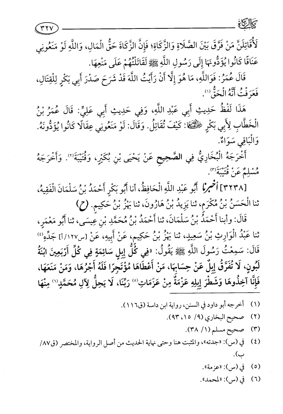 لَأُقَاتِلَنَّ مَنْ فَرَّقَ بَيْنَ الصَّلَاةِ وَالزَّكَاةِ؛ فَإِنَّ الزَّكَاةَ حَقُّ الْمَالِ، وَاللَّهِ لَوْ مَنَعُونِي عَنَاقًا كَانُوا يُؤَدُّونَهَا إِلَى رَسُولِ اللَّهِ - صلى الله عليه وسلم - لَقَاتَلْتُهُمْ عَلَى مَنْعِهَا.