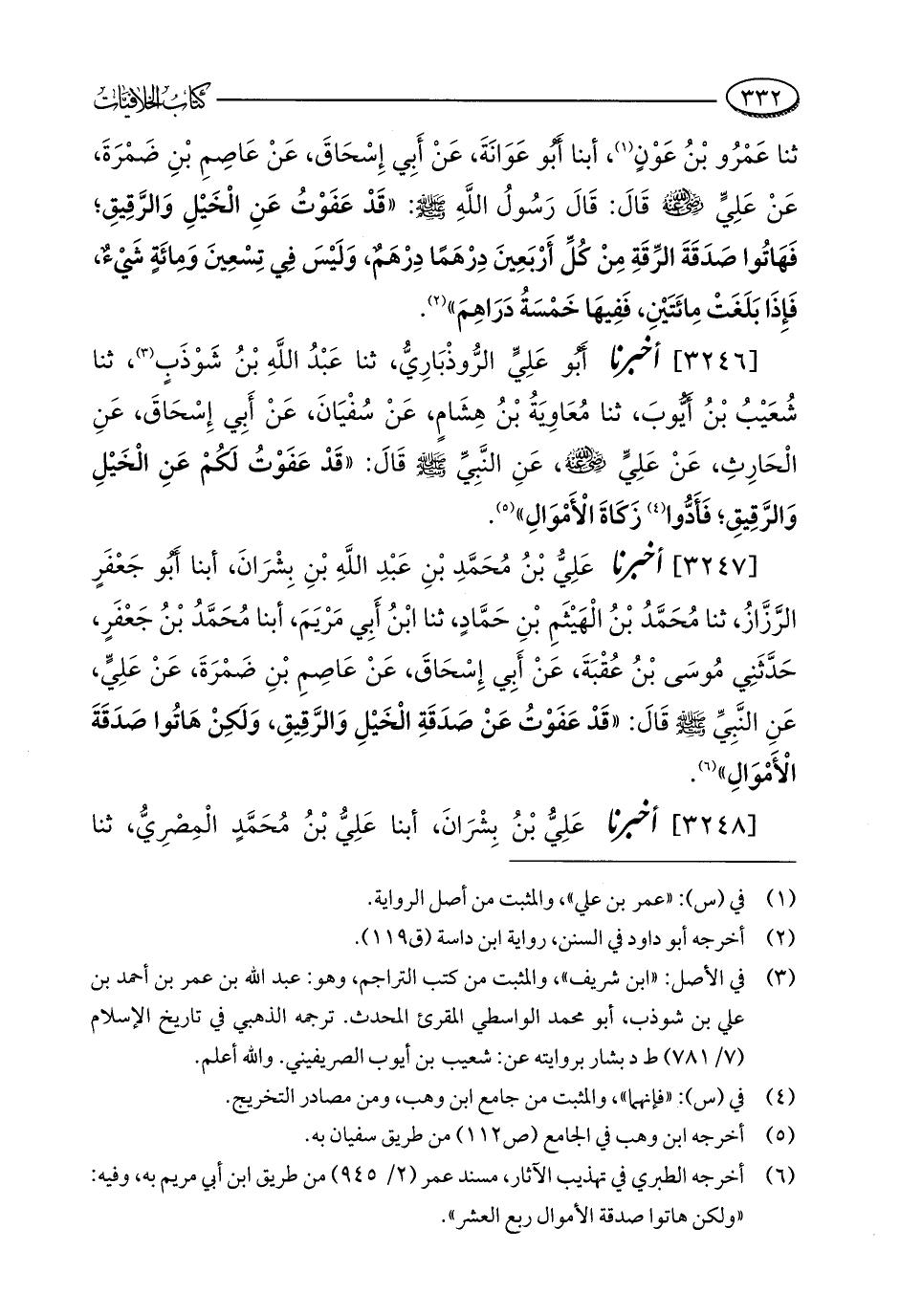 [3247] أخبرنا عَلِيُّ بْنُ مُحَمَّدِ بْنِ عَبْدِ اللَّهِ بْنِ بِشْرَانَ، أبنا أَبُو جَعْفَرٍ الرَّزَّازُ، ثنا مُحَمَّدُ بْنُ الْهَيْثَمِ بْنِ حَمَّادٍ، ثنا ابْنُ أَبِي مَرْيَمَ، أبنا مُحَمَّدُ بْنُ جَعْفَرٍ، حَدَّثَنِي مُوسَى بْنُ عُقْبَةَ، عَنْ أَبِي إِسْحَاقَ، عَنْ عَاصِمِ بْنِ ضَمْرَةَ، عَنْ عَلِيٍّ، عَنِ النَّبِيِّ - صلى الله عليه وسلم - قالَ: "قَدْ عَفَوْتُ عَنْ صَدَقَةِ الْخَيْلِ وَالرَّقِيقِ، وَلَكِنْ هَاتُوا صَدَقَةَ الْأَمْوَالِ" (¬6).