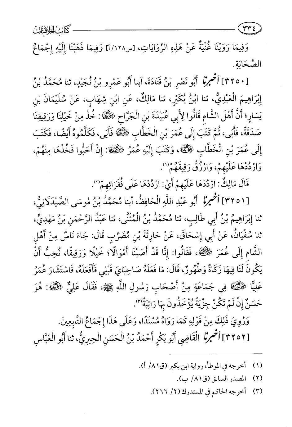 [3250] أخبرنا أَبُو نَصْرِ بْنُ قَتَادَةَ، أبنا أَبُو عَمْرِو بْنُ نُجَيْدٍ، ثنا مُحَمَّدُ بْنُ إِبْرَاهِيمَ الْعَبْدِيُّ، ثنا ابْنُ بُكَيْرٍ، ثنا مَالِكٌ، عَنِ ابْنِ شِهَابٍ، عَنْ سُلَيْمَانَ بْنِ يَسَارٍ؛ أَنَّ أَهْلَ الشَّامِ قَالُوا لِأَبِي عُبَيْدَةَ بْنِ الْجَرَّاحِ - رضي الله عنه -: خُذْ مِنْ خَيْلِنَا وَرَقِيقِنَا صَدَقَةً، فَأَبَى، ثُمَّ كَتَبَ إِلَى عُمَرَ بْنِ الْخَطَّابِ - رضي الله عنه - فَأَبَى، فَكَلَّمُوهُ أَيْضًا، فَكَتَبَ إِلَى عُمَرَ بْنِ الْخَطَّابِ - رضي الله عنه -، وَكَتَبَ إِلَيْهِ عُمَرُ - رضي الله عنهما -: إِنْ أَحَبُّوا فَخُذْهَا مِنْهُمْ، وَارْدُدْهَا عَلَيْهِمْ، وَارْزُقْ رَقِيقَهُمْ (¬1).