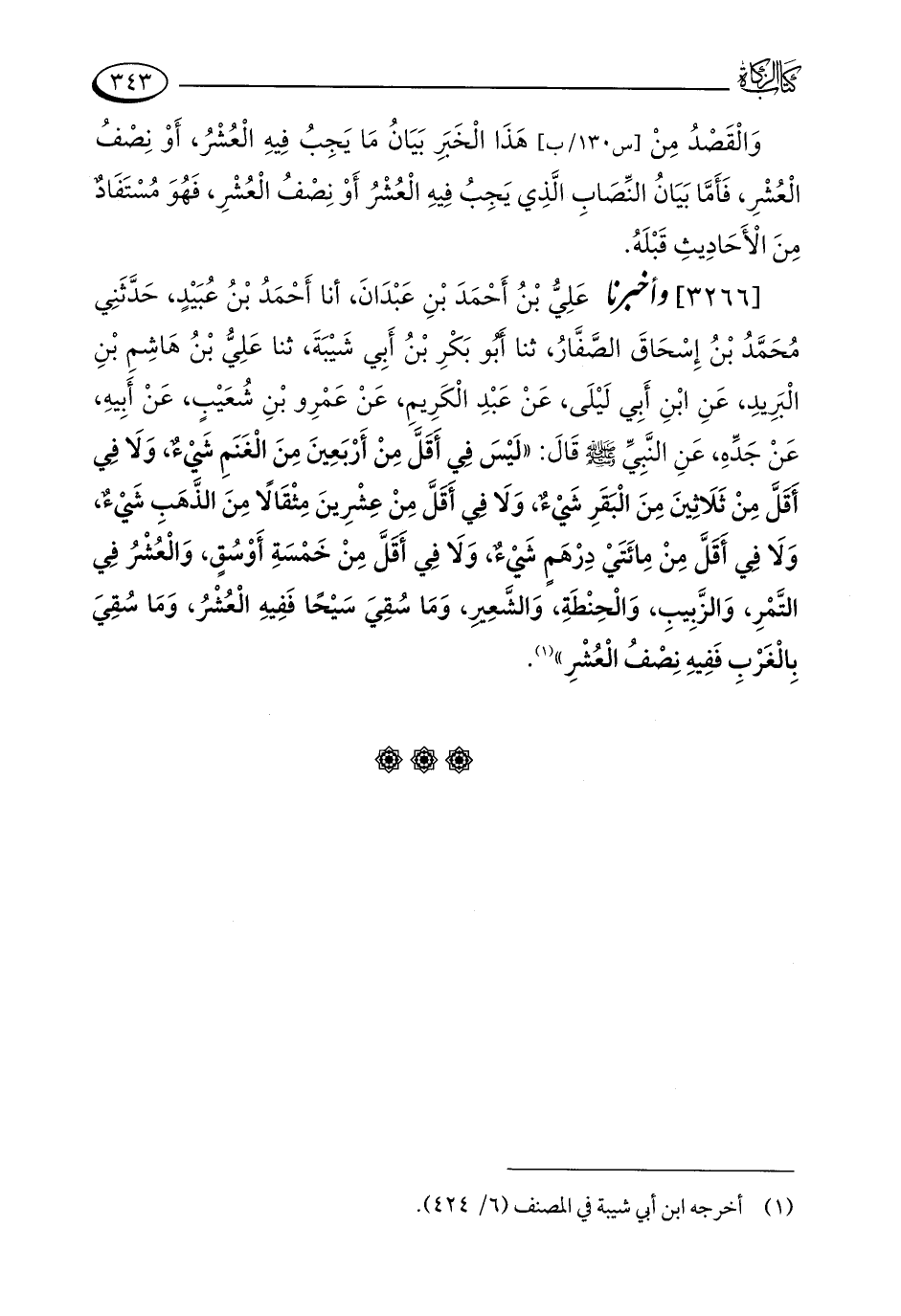 [3266] وأخبرنا عَلِيُّ بْنُ أَحْمَدَ بْنِ عَبْدَانَ، أنا أَحْمَدُ بْنُ عُبَيْدٍ، حَدَّثَنِي مُحَمَّدُ بْنُ إِسْحَاقَ الصَّفَّارُ، ثنا أَبُو بَكْرِ بْنُ أَبِي شَيْبَةَ، ثنا عَلِيُّ بْنُ هَاشِمِ بْنِ الْبَرِيدِ، عَنِ ابْنِ أَبِي لَيْلَى، عَنْ عَبْدِ الْكَرِيمِ، عَنْ عَمْرِو بْنِ شُعَيْبٍ، عَنْ أَبِيهِ، عَنْ جَدِّهِ، عَنِ النَّبِيِّ - صلى الله عليه وسلم - قَالَ: "لَيْسَ فِي أَقَلَّ مِنْ أَرْبَعِينَ مِنَ الْغَنَمِ شَيْءٌ، وَلَا فِي أَقَلَّ مِنْ ثَلَاِثِينَ مِنَ الْبَقَرِ شَيْءٌ، وَلَا فِي أَقَلَّ مِنْ عِشْرِينَ مِثْقَالًا مِنَ الذَّهَبِ شَيْءٌ، وَلَا فِي أَقَلَّ مِنْ مِائَتَيْ دِرْهَمٍ شَيْءٌ، وَلَا فِي أَقَلَّ مِنْ خَمْسَةِ أَوْسُقٍ، وَالْعُشْرُ فِي التَّمْرِ، وَالزَّبِيبِ، وَالْحِنْطَةِ، وَالشَّعِيرِ، وَمَا سُقِيَ سَيْحًا فَفِيهِ الْعُشْرُ، وَمَا سُقِيَ بِالْغَرْبِ فَفِيهِ نِصْفُ الْعُشْرِ" (¬1).