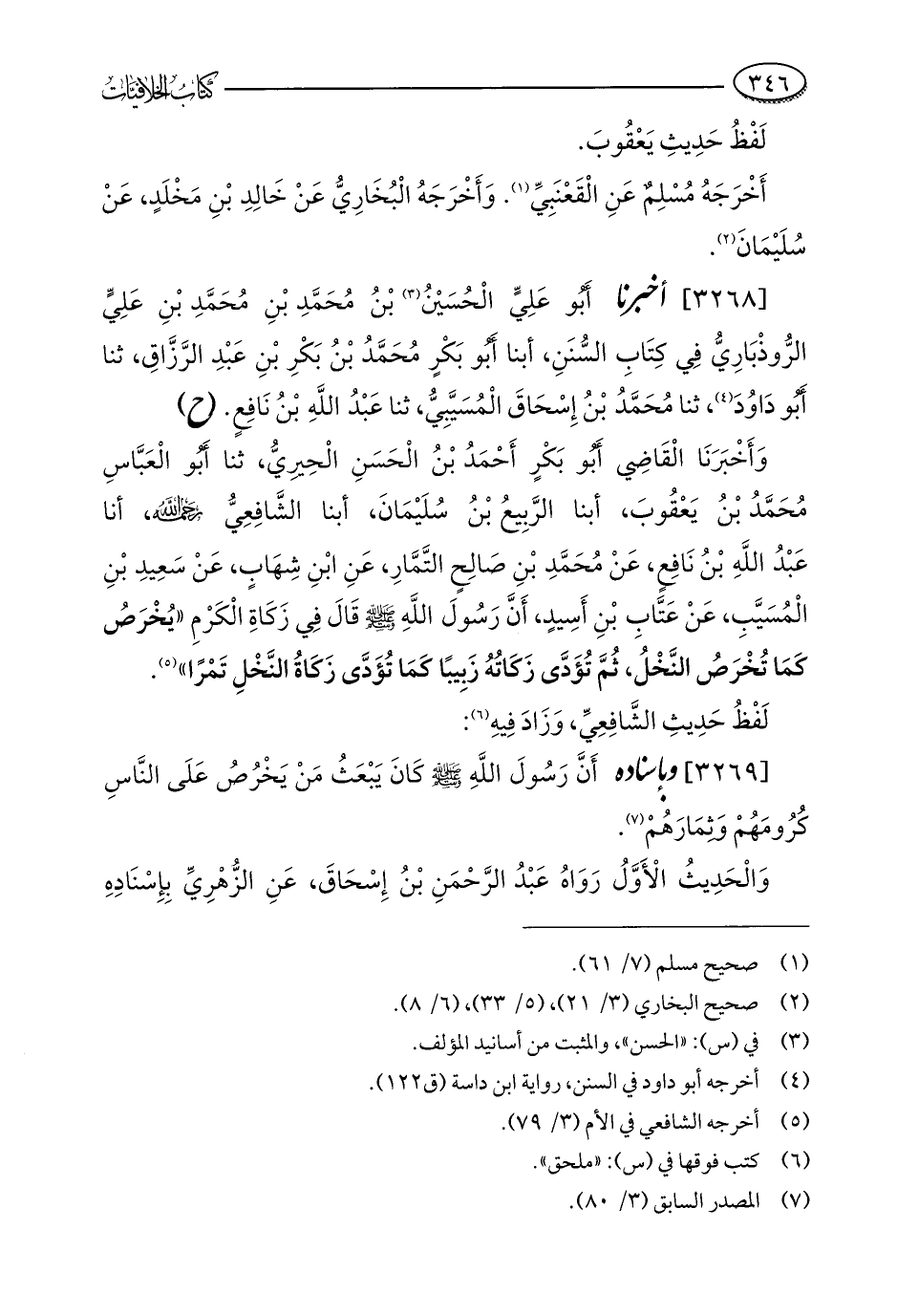 [3269] وبإسناده أَنَّ رَسُولَ اللَّهِ - صلى الله عليه وسلم - كَانَ يَبْعَثُ مَنْ يَخْرُصُ عَلَى النَّاسِ كُرُومَهُمْ وَثِمَارَهُمْ (¬7).