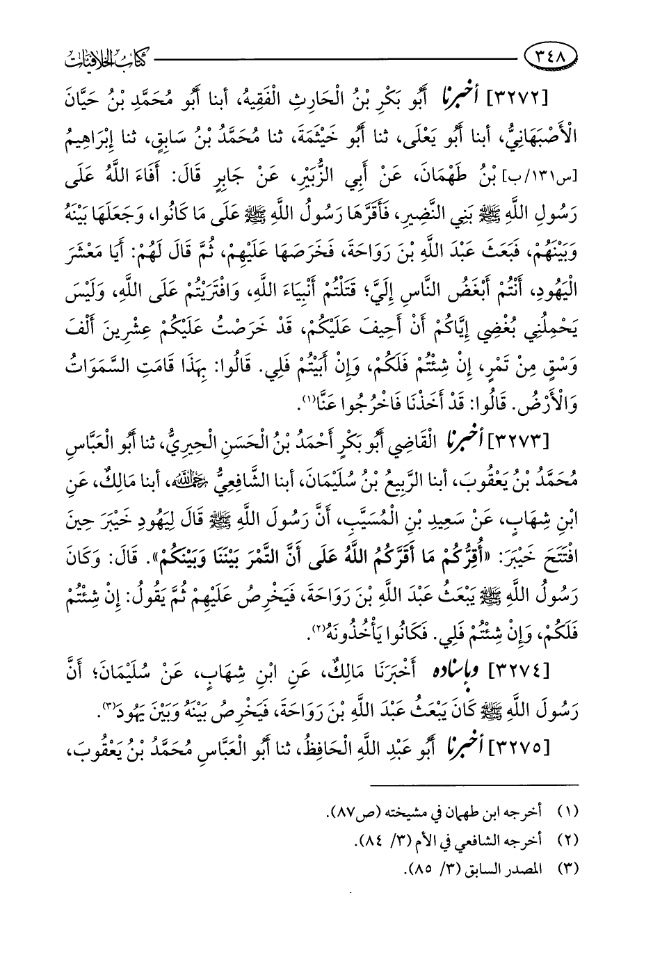 [3274] وبإسناده أَخْبَرَنَا مَالِكٌ، عَنِ ابْنِ شِهَابٍ، عَنْ سُلَيْمَانَ؛ أَنَّ رَسُولَ اللَّهِ - صلى الله عليه وسلم - كَانَ يَبْعَثُ عَبْدَ اللَّهِ بْنَ رَوَاحَةَ، فَيَخْرِصُ بَيْنَهُ وَبَيْنَ يَهُودَ (¬3).