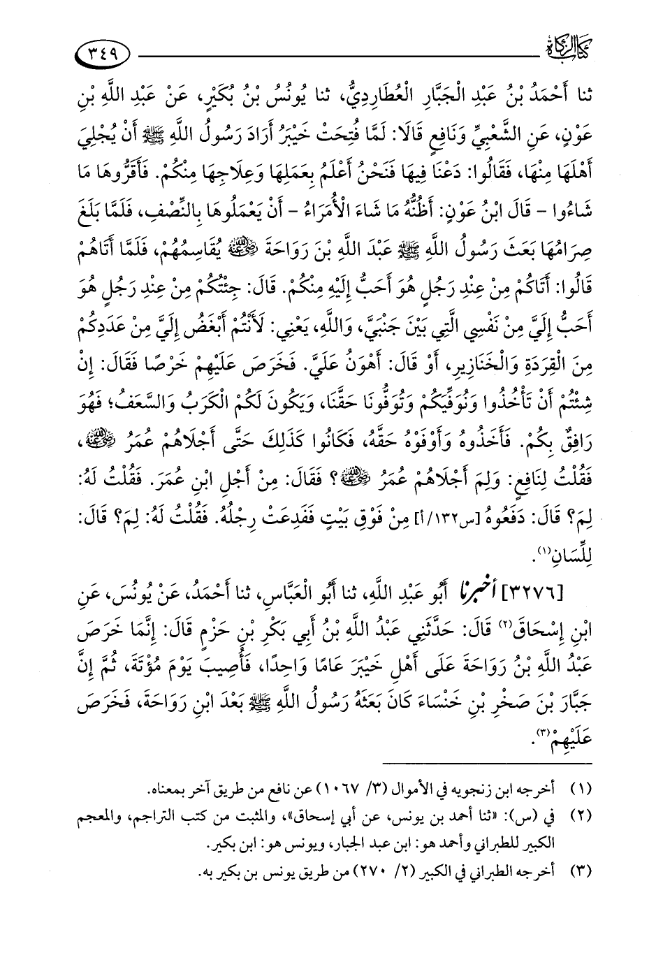ثنا أَحْمَدُ بْنُ عَبْدِ الْجَبَّارِ الْعُطَارِدِيُّ، ثنا يُونُسُ بْنُ بُكَيْرٍ، عَنْ عَبْدِ اللَّهِ بْنِ عَوْنٍ، عَنِ الشَّعْبِيِّ وَنَافِعٍ قَالَا: لَمَّا فُتِحَتْ خَيْبَرُ أَرَادَ رَسُولُ اللَّهِ - صلى الله عليه وسلم - أَنْ يُجْلِيَ أَهْلَهَا مِنْهَا، فَقَالُوا: دَعْنَا فِيهَا فَنَحْنُ أَعْلَمُ بِعَمَلِهَا وَعِلَاجِهَا مِنْكُمْ. فَأَقَرُّوهَا مَا شَاءُوا - قَالَ ابْنُ عَوْنٍ: أَظُنُّهُ مَا شَاءَ الْأُمَرَاءُ - أَنْ يَعْمَلُوهَا بِالنِّصْفِ، فَلَمَّا بَلَغَ صِرَامُهَا بَعَثَ رَسُولُ اللَّهِ - صلى الله عليه وسلم - عبْدَ اللَّهِ بْنَ رَوَاحَةَ - رضي الله عنه - يُقَاسِمُهُمْ، فَلَمَّا أَتَاهُمْ قَالُوا: أَتَاكُمْ مِنْ عِنْدِ رَجُلٍ هُوَ أَحَبُّ إِلَيْهِ مِنْكُمْ. قَالَ: جِئْتُكُمْ مِنْ عِنْدِ رَجُلٍ هُوَ أَحَبُّ إِلَيَّ مِنْ نَفْسِي الَّتِي بَيْنَ جَنْبَيَّ، وَاللَّهِ، يَعْنِي: لَأَنْتُمْ أَبْغَضُ إِلَيَّ مِنْ عَدَدِكُمْ مِنَ الْقِرَدَةِ وَالْخَنَازِيرِ، أَوْ قَالَ: أَهْوَنُ عَلَيَّ. فَخَرَصَ عَلَيْهِمْ خَرْصًا فَقَالَ: إِنْ شِئْتُمْ أَنْ تَأْخُذُوا وَنُوَفِّيَكُمْ وَتُوَفُّونَا حَقَّنَا، وَيَكُونَ لَكُمْ الْكَرَبُ وَالسَّعَفُ؛ فَهُوَ رَافِقٌ بِكُمْ. فَأَخَذُوهُ وَأَوْفَوْهُ حَقَّهُ، فَكَانُوا كَذَلِكَ حَتَّى أَجْلَاهُمْ عُمَرُ - رضي الله عنه -، فَقُلْتُ لِنَافِعٍ: وَلِمَ أَجْلَاهُمْ عُمَرُ - رضي الله عنه -؟ فَقَالَ: مِنْ أَجْلِ ابْنِ عُمَرَ. فَقُلْتُ لَهُ: لِمَ؟ قَالَ: دَفَعُوهُ مِنْ فَوْقِ بَيْتٍ فَفَدِعَتْ رِجْلُهُ. فَقُلْتُ لَهُ: لِمَ؟ قَالَ: لِلِّسَانِ (¬1).