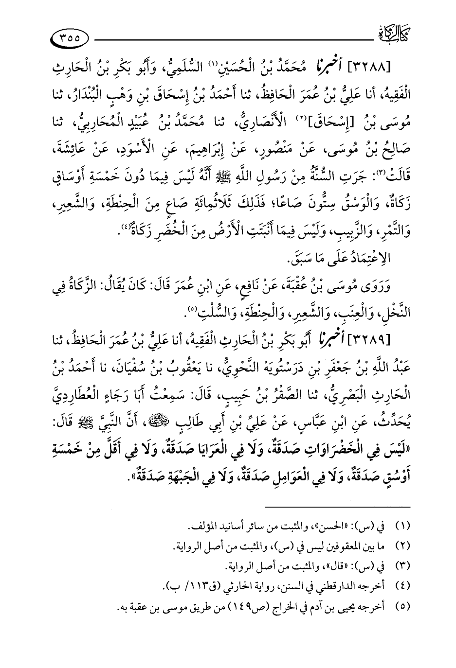 [3289] أخبرنا أَبُو بَكْرِ بْنُ الْحَارِثِ الْفَقِيهُ، أنا عَلِيُّ بْنُ عُمَرَ الْحَافِظُ، ثنا عَبْدُ اللَّهِ بْنُ جَعْفَرِ بْنِ دَرَسْتُويَهْ النَّحْوِيُّ، نا يَعْقُوبُ بْنُ سُفْيَانَ، نا أَحْمَدُ بْنُ الْحَارِثِ الْبَصْرِيُّ، ثنا الصَّقْرُ بْنُ حَبِيبٍ، قَالَ: سَمِعْتُ أَبَا رَجَاءٍ الْعُطَارِدِيَّ يُحَدِّثُ، عَنِ ابْنِ عَبَّاسٍ، عَنْ عَلِيِّ بْنِ أَبِي طَالِبٍ - رضي الله عنه -، أَنَّ النَّبِيَّ - صلى الله عليه وسلم - قَالَ: "لَيْسَ فِي الْخَضْرَاوَاتِ صَدَقَةٌ، وَلَا في الْعَرَايَا صَدَقَةٌ، وَلَا في أَقَلَّ مِنْ خَمْسَةِ أَوْسُقٍ صَدَقَةٌ، وَلَا فِي الْعَوَامِلِ صَدَقَةٌ، وَلَا فِي الْجَبْهَةِ صَدَقَةٌ".