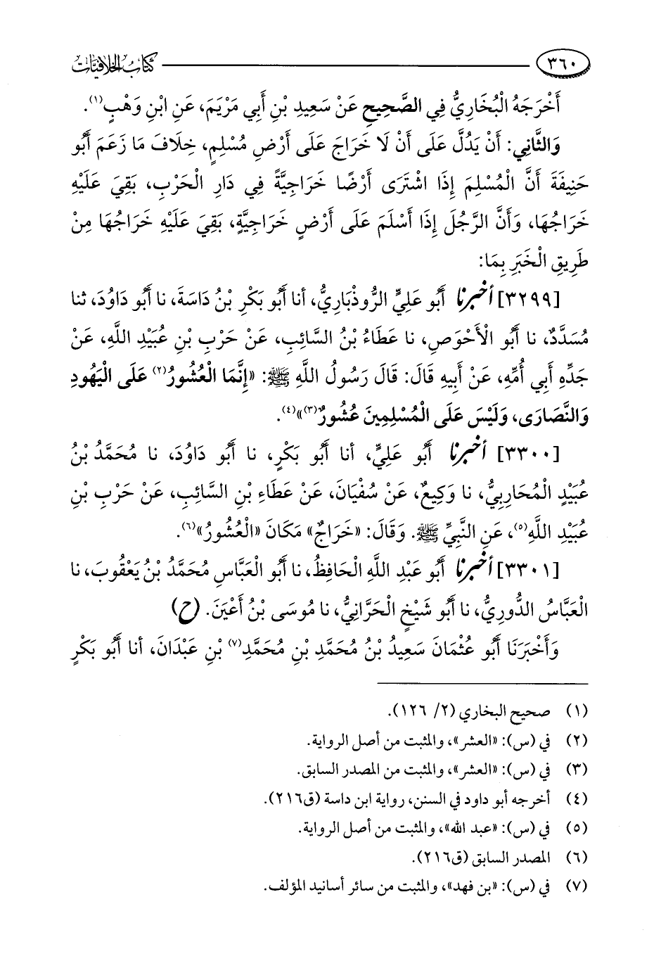 [3300] أخبرنا أَبُو عَلِيٍّ، أنا أَبُو بَكْرٍ، نا أَبُو دَاوُدَ، نا مُحَمَّدُ بْنُ عُبَيْدٍ الْمُحَارِبِيُّ، نا وَكِيعٌ، عَنْ سُفْيَانَ، عَنْ عَطَاءِ بْنِ السَّائِبِ، عَنْ حَرْبِ بْنِ عُبَيْدِ اللَّهِ (¬5)، عَنِ النَّبِيِّ - صلى الله عليه وسلم -. وَقَالَ: "خَرَاجٌ" مَكَانَ "الْعُشُورُ" (¬6).