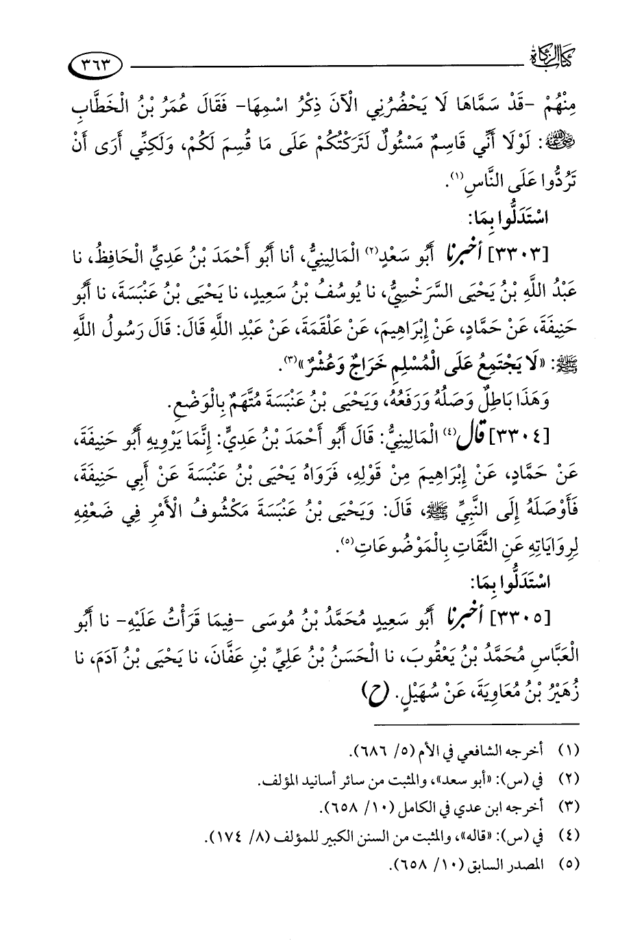 [3303] أخبرنا أَبُو سعْدٍ (¬2) الْمَالِينِيُّ، أنا أَبُو أَحْمَدَ بْنُ عَدِيٍّ الْحَافِظُ، نا عَبْدُ اللَّهِ بْنُ يَحْيَى السَّرَخْسِيُّ، نا يُوسُفُ بْنُ سَعِيدٍ، نا يَحْيَى بْنُ عَنْبَسَةَ، نا أَبُو حَنِيفَةَ، عَنْ حَمَّادٍ، عَنْ إِبْرَاهِيمَ، عَنْ عَلْقَمَةَ، عَنْ عَبْدِ اللَّهِ قَالَ: قَالَ رَسُولُ اللَّهِ - صلى الله عليه وسلم -: "لَا يَجْتَمِعُ عَلَى الْمُسْلِمِ خَرَاجٌ وَعُشْرٌ" (¬3).