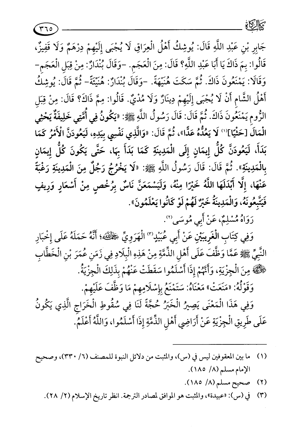 وَفِي كِتَابِ الْغَرِيبَيْنِ عَنْ أَبِي عُبَيْدٍ (¬3) الْهَرَوِيِّ - رحمه الله -؛ أَنَّهُ حَمَلَهُ عَلَى إِخْبَارِ النَّبِيِّ - صلى الله عليه وسلم - عَمَّا وَظَّفَ عَلَى أَهْلِ الذِّمَّةِ مِنْ هَذِهِ الْبِلَادِ فِي زَمَنِ عُمَرَ بْنِ الْخَطَّابِ - رضي الله عنه - مِنَ الْجِزْيَةِ، وَأَنَّهُمْ إِذَا أَسْلَمُوا سَقَطَتْ عَنْهُمْ بِذَلِكَ الْجِزْيَةُ.