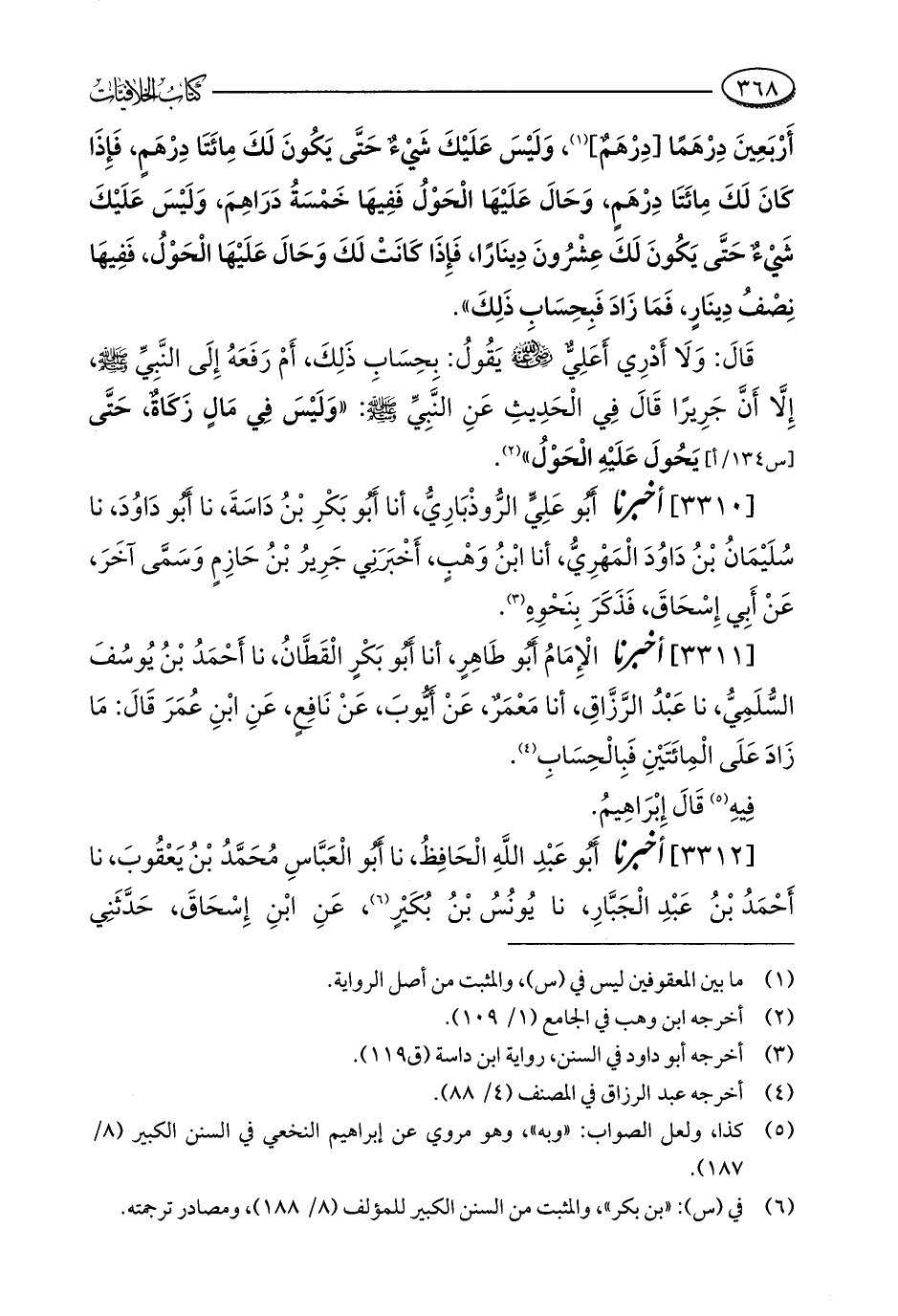 [3311] أخبرنا الْإِمَامُ أَبُو طَاهِرٍ، أنا أَبُو بَكْرٍ الْقَطَّانُ، نا أَحْمَدُ بْنُ يُوسُفَ السُّلَمِيُّ، نا عَبْدُ الرَّزَّاقِ، أنا مَعْمَرٌ، عَنْ أَيُّوبَ، عَنْ نَافِعٍ، عَنِ ابْنِ عُمَرَ قَالَ: مَا زَادَ عَلَى الْمِائَتَيْنِ فَبِالْحِسَابِ (¬4).