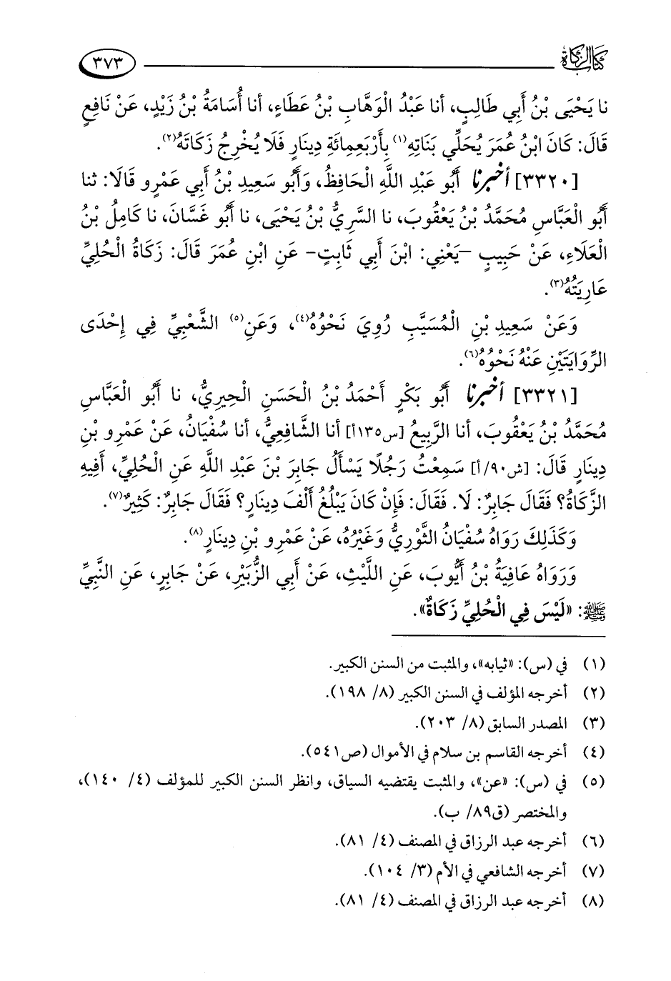 [3320] أخبرنا أَبُو عَبْدِ اللَّهِ الْحَافِظُ، وَأبُو سَعِيدِ بْنُ أَبِي عَمْرٍو قَالَا: ثنا أَبُو الْعَبَّاسِ مُحَمَّدُ بْنُ يَعْقُوبَ، نا السَّرِيُّ بْنُ يَحْيَى، نا أَبُو غَسَّانَ، نا كَامِلُ بْنُ الْعَلَاءِ، عَن حَبِيبٍ - يَعْنِي: ابْنَ أَبِي ثَابِتٍ - عَنِ ابْنِ عُمَرَ قَالَ: زَكَاةُ الْحُلِيِّ عَارِيَتُهُ (¬3).