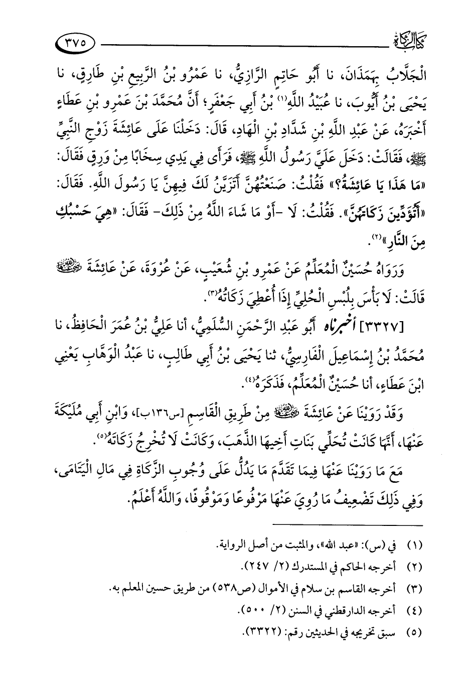 وَرَوَاهُ حُسَيْنٌ الْمُعَلِّمُ عَنْ عَمْرِو بْنِ شُعَيْبٍ، عَنْ عُرْوَةَ، عَنْ عَائِشَةَ - رضي الله عنها - قَالَتْ: لَا بَأْسَ بِلُبْسِ الْحُلِيِّ إِذَا أُعْطِيَ زَكَاتُهُ (¬3).