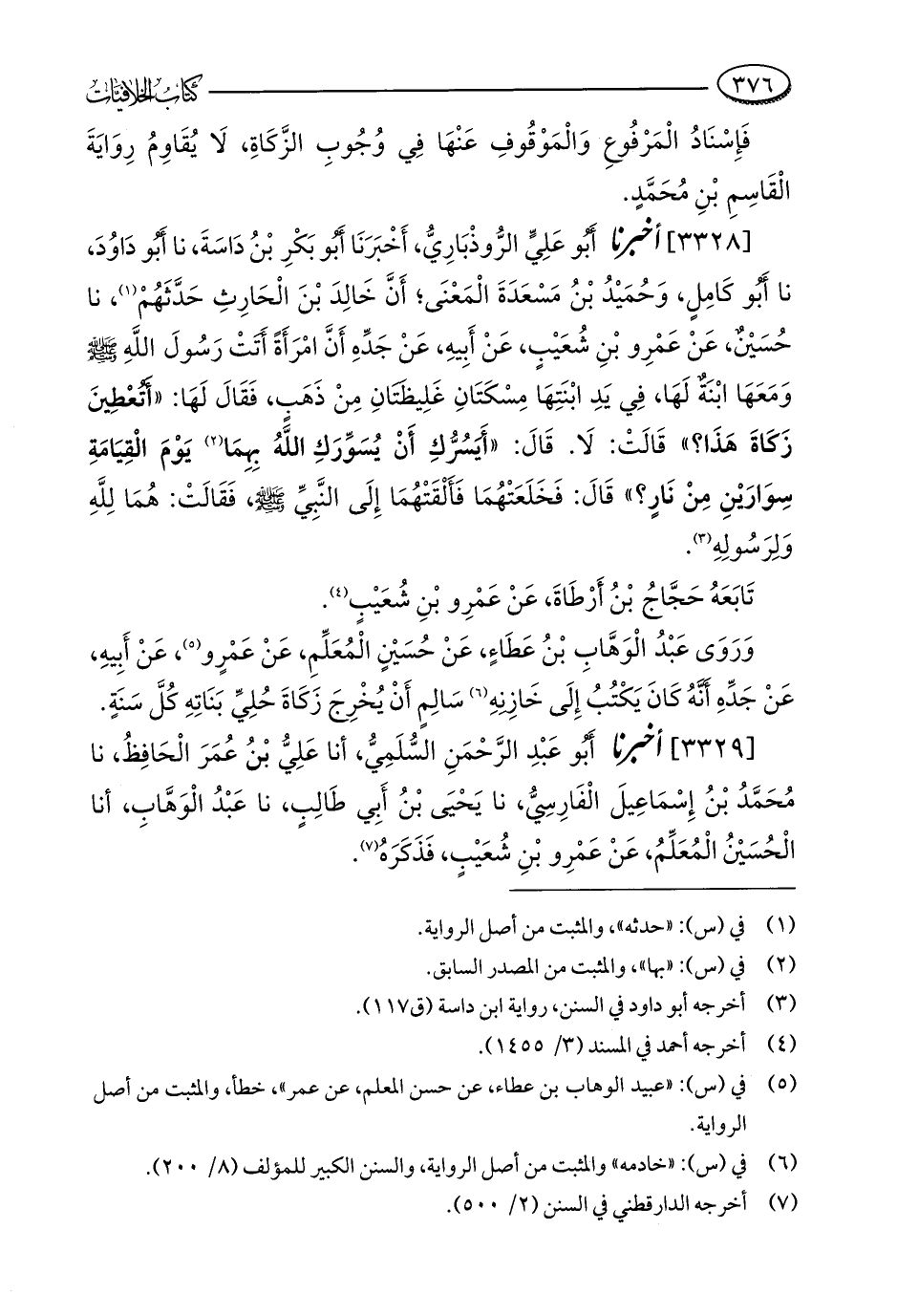 [3328] أخبرنا أَبُو عَلِيٍّ الرُّوذْبَارِيُّ، أَخْبَرَنَا أَبُو بَكْرِ بْنُ دَاسَةَ، نا أَبُو دَاوُدَ، نا أَبُو كَامِلٍ، وَحُمَيْدُ بْنُ مَسْعَدَةَ الْمَعْنَى؛ أَنَّ خَالِدَ بْنَ الْحَارِثِ حَدَّثَهُمْ (¬1)، نا حُسَيْنٌ، عَنْ عَمْرِو بْنِ شُعَيْبٍ، عَنْ أَبِيهِ، عَنْ جَدِّهِ أَنَّ امْرَأَةً أَتَتْ رَسُولَ اللَّهِ - صلى الله عليه وسلم - وَمَعَهَا ابْنَةٌ لَهَا، فِي يَدِ ابْنَتِهَا مِسْكَتَانِ غَلِيظَتَانِ مِنْ ذَهَبٍ، فَقَالَ لَهَا: "أَتُعْطِينَ زَكَاةَ هَذَا؟ " قَالَتْ: لَا. قَالَ: "أَيَسُرُّكِ أَنْ يُسَوِّرَكِ اللَّهُ بِهِمَا (¬2) يَوْمَ الْقِيَامَةِ سِوَارَيْنِ مِنْ نَارٍ؟ " قَالَ: فَخَلَعَتْهُمَا فَأَلْقَتْهُمَا إِلَى النَّبِيِّ - صلى الله عليه وسلم -، فَقَالَتْ: هُمَا لِلَّهِ وَلِرَسُولِهِ (¬3).