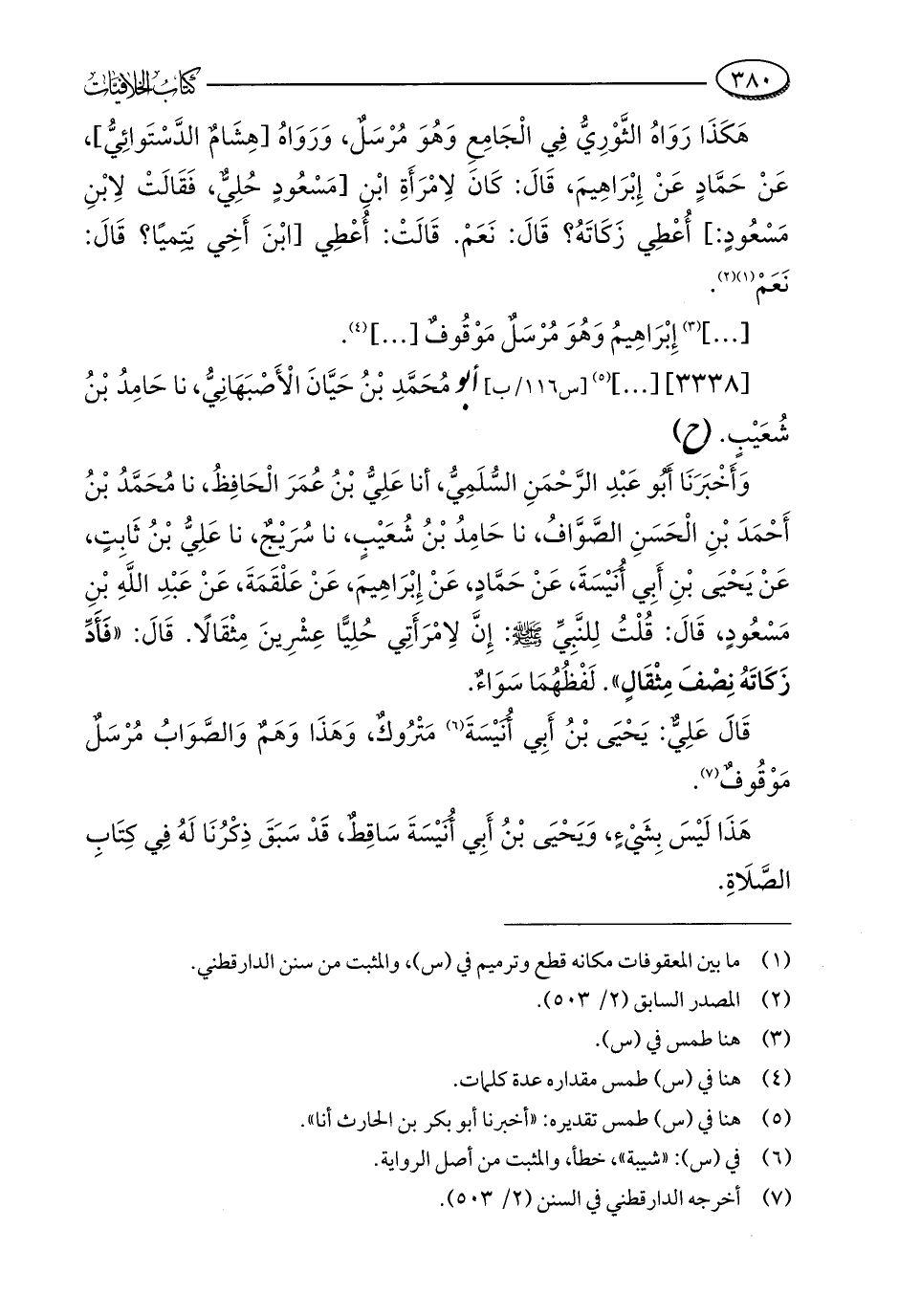 هَكَذَا رَوَاهُ الثَّوْرِيُّ فِي الْجَامِعِ وَهُوَ مُرْسَلٌ، وَرَوَاهُ [هِشَامٌ الدَّسْتَوائِيُّ]، عَنْ حَمَّادٍ عَنْ إِبْرَاهِيمَ، قَالَ: كَانَ لِامْرَأَةِ ابْنِ [مَسْعُودٍ حُلِيٌّ، فَقَالَتْ لِابْنِ مَسْعُودٍ: ] أُعْطِي زَكَاتَهُ؟ قَالَ: نَعَمْ. قَالَتْ: أُعْطِي [ابْنَ أَخِي يَتِيمًا؟ قَالَ: نَعَمْ (¬1) (¬2).