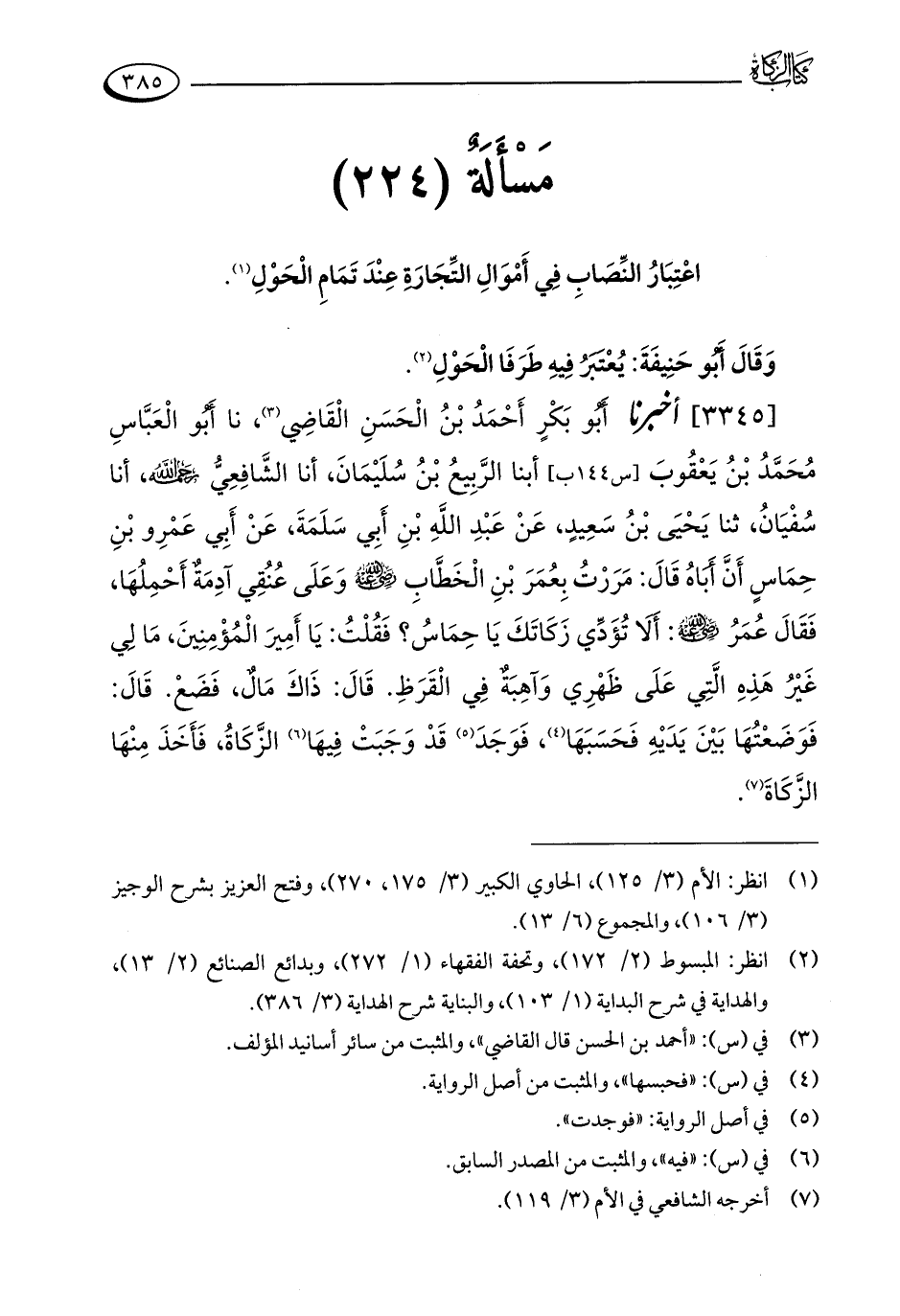 [3345] أخبرنا أَبُو بَكْرٍ أَحْمَدُ بْنُ الْحَسَنِ الْقَاضِي (¬3)، نا أَبُو الْعَبَّاسِ مُحَمَّدُ بْنُ يَعْقُوبَ أبنا الرَّبِيعُ بْنُ سُلَيْمَانَ، أنا الشَّافِعِيُّ - رحمه الله -، أنا سُفْيَانُ، ثنا يَحْيَى بْنُ سَعِيدٍ، عَنْ عَبْدِ اللَّهِ بْنِ أَبِي سَلَمَةَ، عَنْ أَبِي عَمْرِو بْنِ حِمَاسٍ أَنَّ أَبَاهُ قَالَ: مَرَرْتُ بِعُمَرَ بْنِ الْخَطَّابِ - رضي الله عنه - وَعَلَى عُنُقِي آدِمَةٌ أَحْمِلُهَا، فَقَالَ عُمَرُ - رضي الله عنه -: أَلَا تُؤَدِّي زَكَاتَكَ يَا حِمَاسُ؟ فَقُلْتُ: يَا أَمِيرَ الْمُؤْمِنِينَ، مَا لِي غَيْرُ هَذِهِ الَّتِي عَلَى ظَهْرِي وَآهِبَةٌ فِي الْقَرَظِ. قَالَ: ذَاكَ مَالٌ، فَضَعْ. قَالَ: فَوَضَعْتُهَا بَيْنَ يَدَيْهِ فَحَسَبَهَا (¬4)، فَوَجَدَ (¬5) قَدْ وَجَبَتْ فِيهَا (¬6) الزَّكَاةُ، فَأَخَذَ مِنْهَا الزَّكَاةَ (¬7).