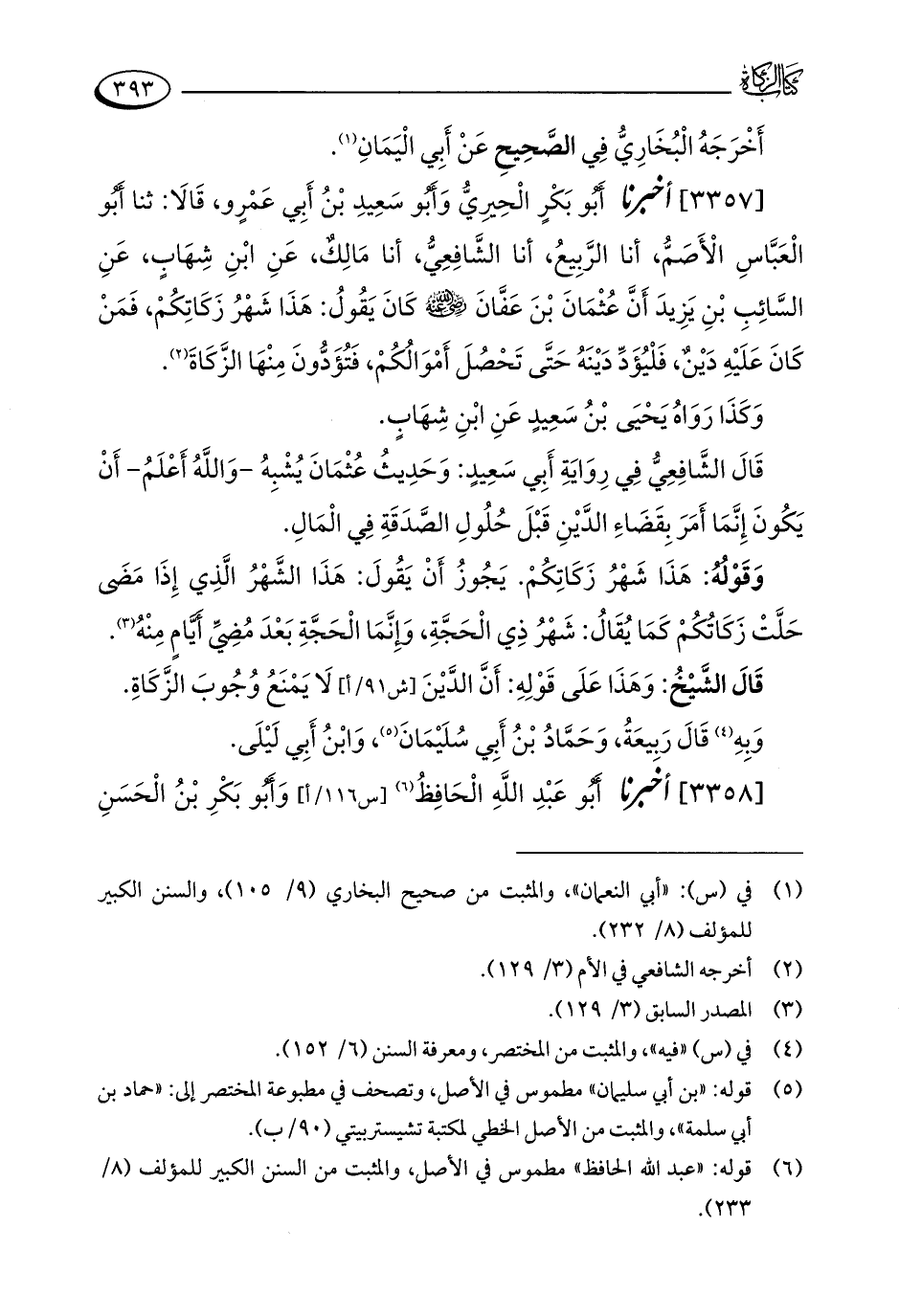 [3357] أخبرنا أَبُو بَكْرٍ الْحِيرِيُّ وَأَبُو سَعِيدِ بْنُ أَبِي عَمْرٍو، قَالَا: ثنا أَبُو الْعَبَّاسِ الْأَصَمُّ، أنا الرَّبِيعُ، أنا الشَّافِعِيُّ، أنا مَالِكٌ، عَنِ ابْنِ شِهَابٍ، عَنِ السَّائِبِ بْنِ يَزِيدَ أَنَّ عُثْمَانَ بْنَ عَفَّانَ - رضي الله عنه - كَانَ يَقُولُ: هَذَا شَهْرُ زَكَاتِكُمْ، فَمَنْ كَانَ عَلَيْهِ دَيْنٌ، فَلْيُؤَدِّ دَيْنَهُ حَتَّى تَحْصُلَ أَمْوَالُكُمْ، فَتُؤَدُّونَ مِنْهَا الزَّكَاةَ (¬2).