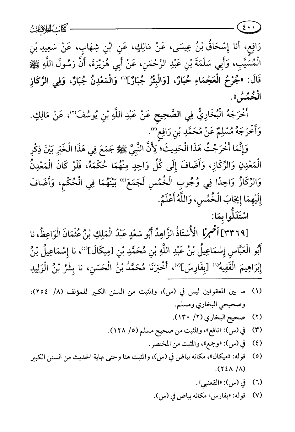 رَافِعٍ، أنا إِسْحَاقُ بْنُ عِيسَى، عَنْ مَالِكٍ، عَنِ ابْنِ شِهَابٍ، عَنْ سَعِيدِ بْنِ الْمُسَيَّبِ، وَأَبِي سَلَمَةَ بْنِ عَبْدِ الرَّحْمَنِ، عَنْ أَبِي هُرَيْرَةَ، أَنَّ رَسُولَ اللَّهِ - صلى الله عليه وسلم - قَالَ: "جُرْحُ الْعَجْمَاءِ جُبَارٌ، [وَالْبِئْرُ جُبَارٌ] (¬1) وَالْمَعْدِنُ جُبَارٌ، وَفِي الرِّكَازِ الْخُمُسُ".