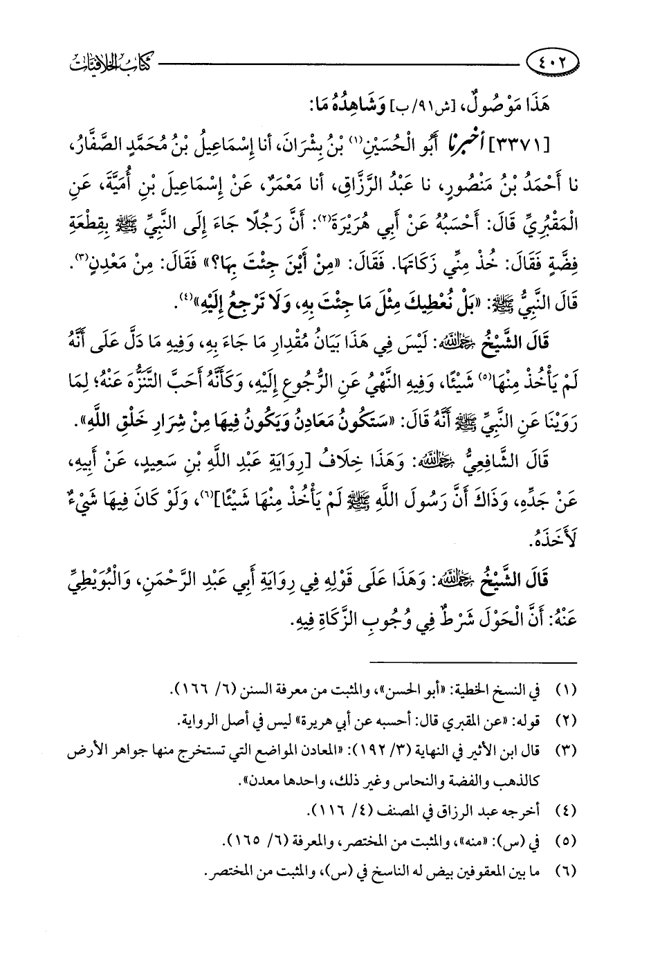 [3371] أخبرنا أَبُو الْحُسَيْنِ (¬1) بْنُ بِشْرَانَ، أنا إِسْمَاعِيلُ بْنُ مُحَمَّدٍ الصَّفَّارُ، نا أَحْمَدُ بْنُ مَنْصُورٍ، نا عَبْدُ الرَّزَّاقِ، أنا مَعْمَرٌ، عَنْ إِسْمَاعِيلَ بْنِ أُمَيَّةَ، عَنِ الْمَقْبُرِيِّ قَالَ: أَحْسَبُهُ عَنْ أَبِي هُرَيْرَةَ (¬2): أَنَّ رَجُلًا جَاءَ إِلَى النَّبِيِّ - صلى الله عليه وسلم - بقِطْعَةِ فِضَّةٍ فَقَالَ: خُذْ مِنِّي زَكَاتهَا. فَقَالَ: "مِنْ أَيْنَ جِئْتَ بِهَا؟ " فَقَالَ: مِنْ مَعْدِنٍ (¬3). قَالَ النَّبيُّ - صلى الله عليه وسلم -: "بَلْ نُعْطِيكَ مِثْلَ مَا جِئْتَ بِهِ، وَلَا تَرْجِعُ إِلَيْهِ" (¬4).